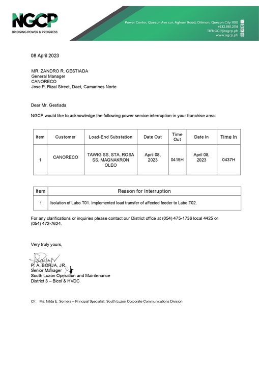 Ang naranasang Emergency Power Service Interruption sa bayan ng PARACALE maliban sa Brgys. Awitan, Bakal, Dancalan, Labnig, Mampungo, Mangkasay at Tabas; at bayan ng JOSE PANGANIBAN maliban sa Brgys. San Martin, Tamisan, Sta. Elena, Sta. Cruz, San Pedro, San Jose, San Isidro, Salvacion, Nakalaya, Dayhagan at Dahican noong April 8, 2023 (Sabado) mula 4:15 ng umaga hanggang 4:37 ng umaga (22 minuto) ay dahil sa β€œIsolation of Labo T01” ng National Grid Corporation of the Philippines (NGCP) na nagresulta sa implementation ng load transfer ng affected feeder sa Labo T02.