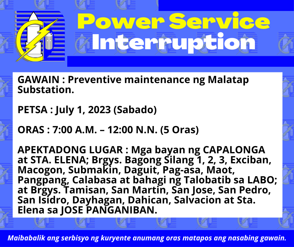 Maaaring maibalik ang serbisyo ng kuryente anumang oras matapos ang nasabing gawain. Para sa kaligtasan ng mga miyembro-konsumidores, parating ituring na may kuryente ang mga linya at mga kagamitan sa lahat ng oras.