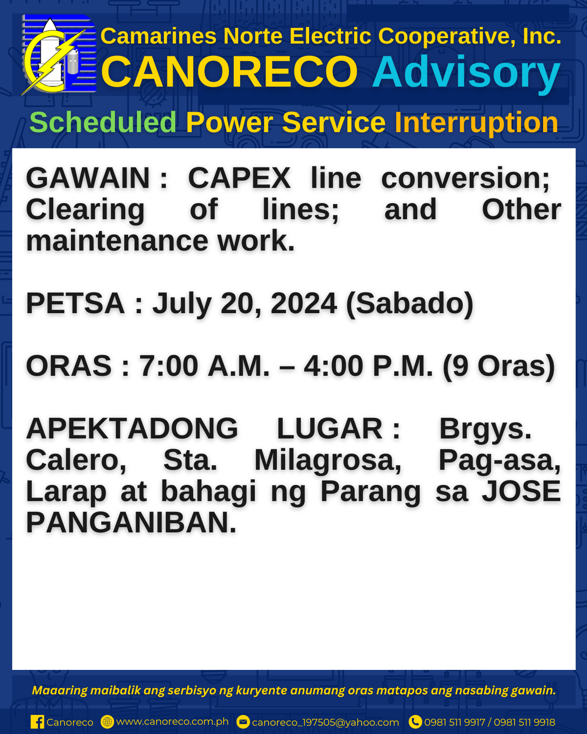 Para sa kaugnay na impormasyon, maaaring bumisita sa CANORECO Official Facebook Page na Canoreco at sa CANORECO Official Website na