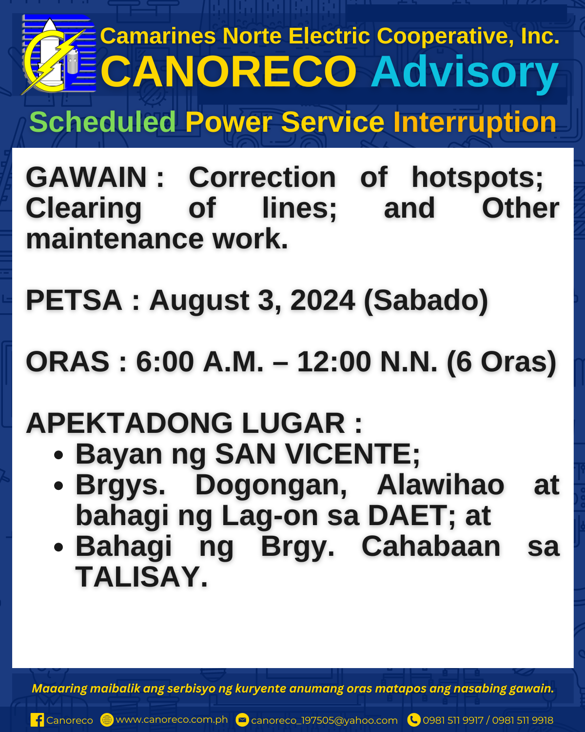 Para sa kaugnay na impormasyon, maaaring bumisita sa CANORECO Official Facebook Page na Canoreco at sa CANORECO Official Website na