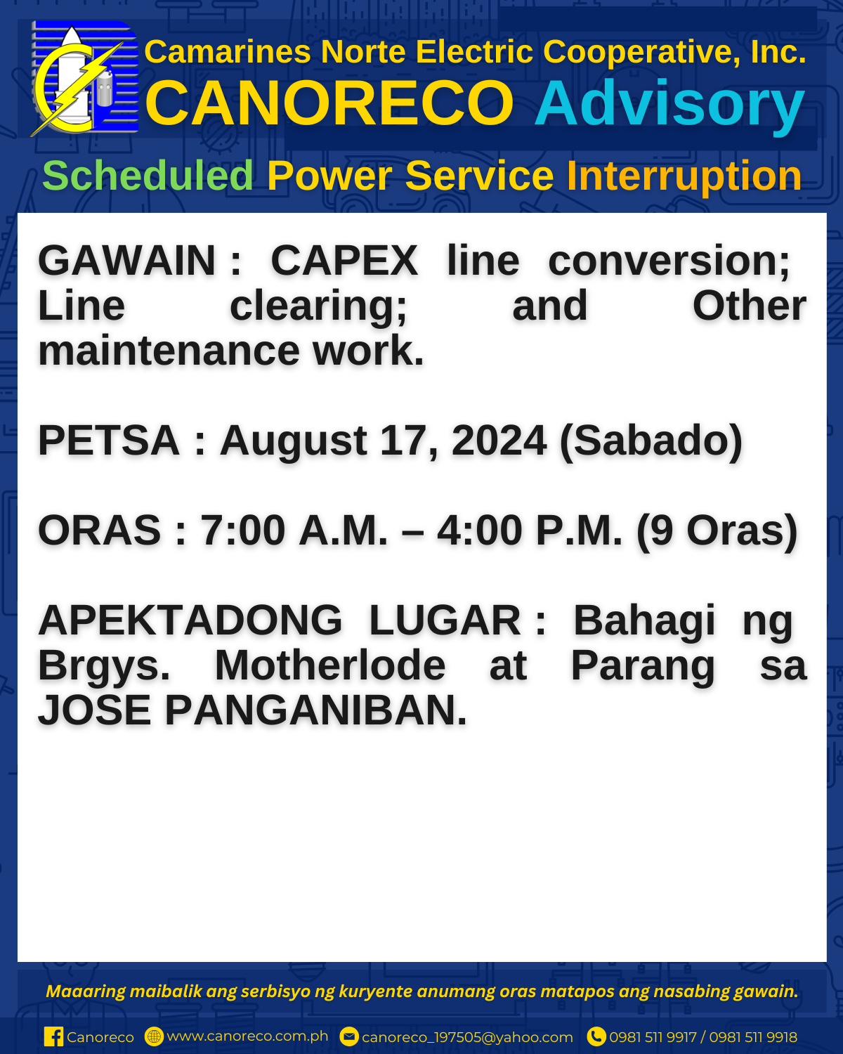 Para sa kaugnay na impormasyon, maaaring bumisita sa CANORECO Official Facebook Page na Canoreco at sa CANORECO Official Website na www.canoreco.com.ph