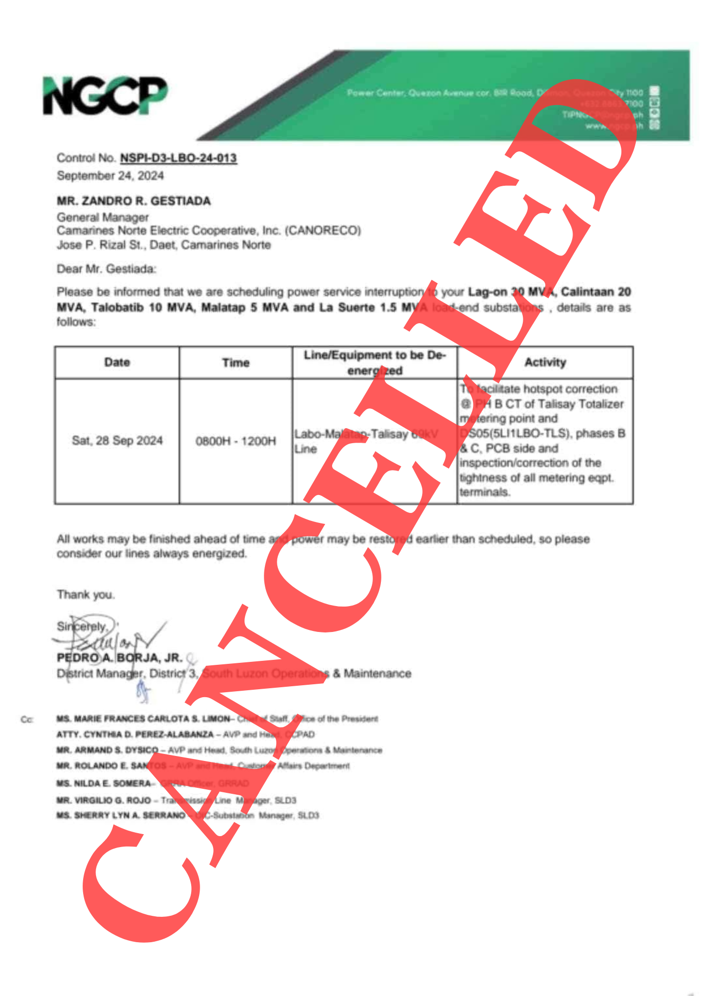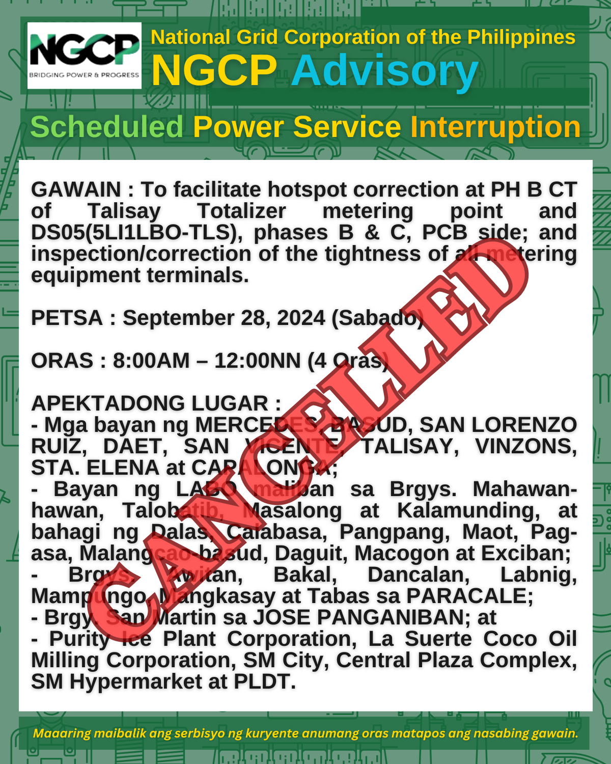 Maaaring maibalik ang serbisyo ng kuryente anumang oras matapos ang nasabing gawain. Para sa kaligtasan ng mga miyembro-konsumidores, parating ituring na may kuryente ang mga linya at mga kagamitan sa lahat ng oras.