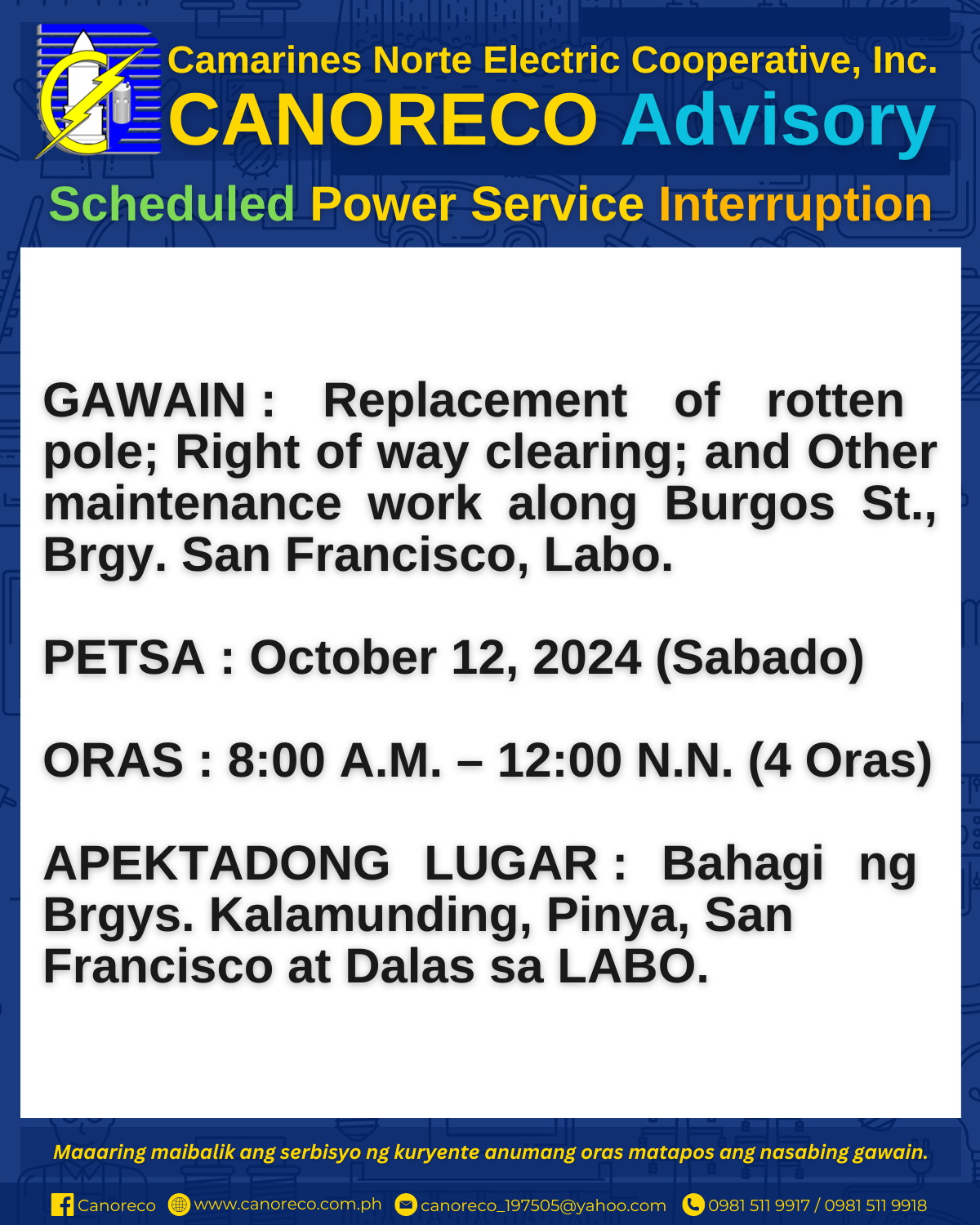 Para sa kaugnay na impormasyon, maaaring bumisita sa CANORECO Official Facebook Page na Canoreco at sa CANORECO Official Website na