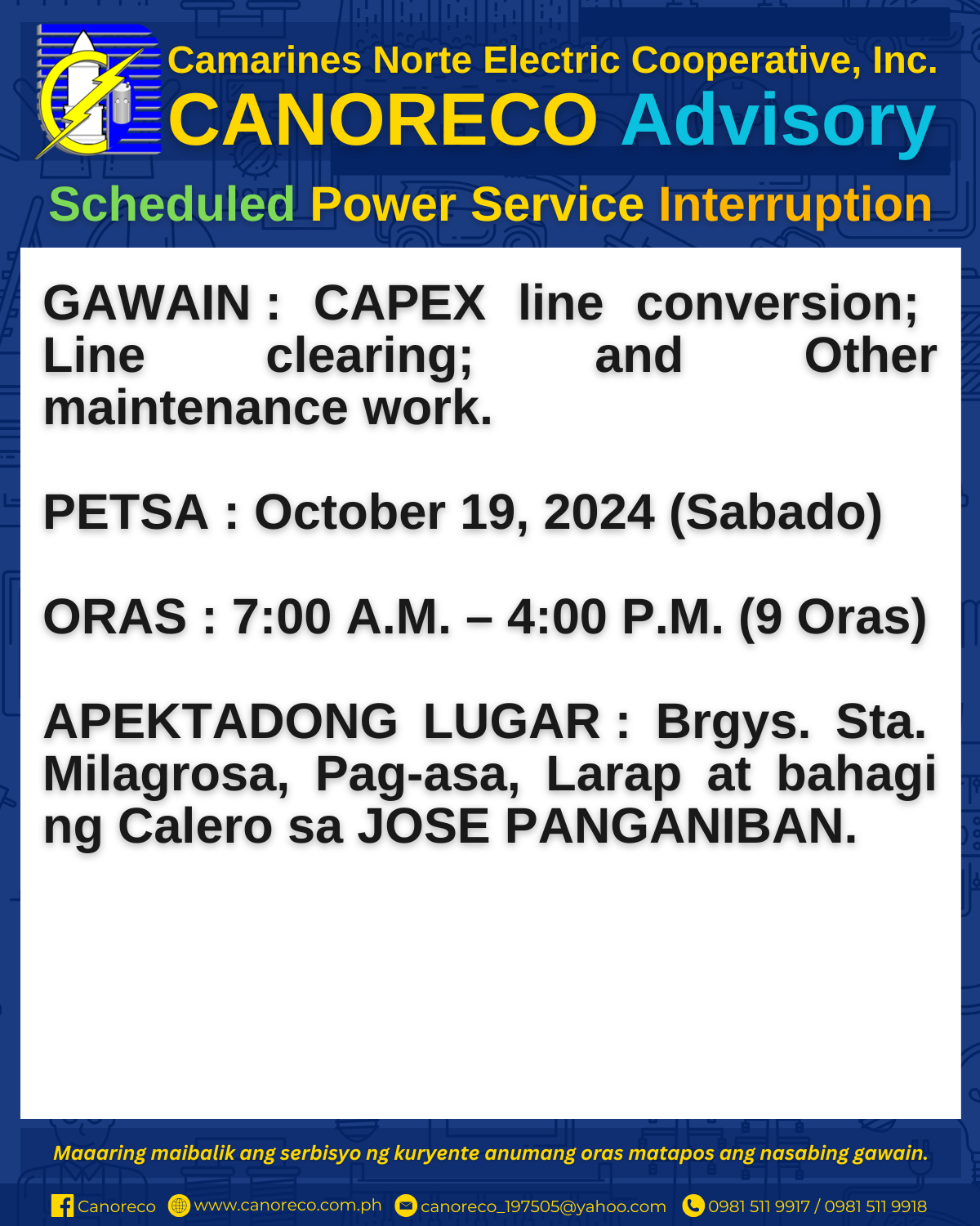 Para sa kaugnay na impormasyon, maaaring bumisita sa CANORECO Official Facebook Page na Canoreco at sa CANORECO Official Website na