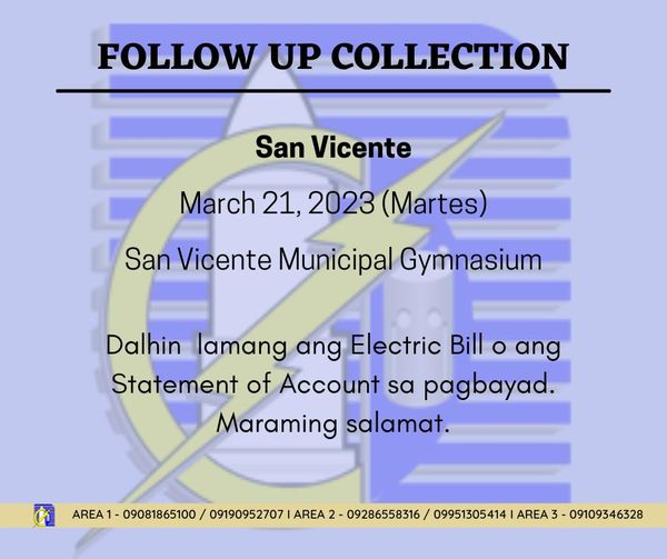 Maaari po ritong magbayad ng kanilang bayarin sa kuryente ang mga taga-bayan ng San Vicente. Pakidala lamang po ang electric bill o ang statement of account sa inyong pagbayad.
