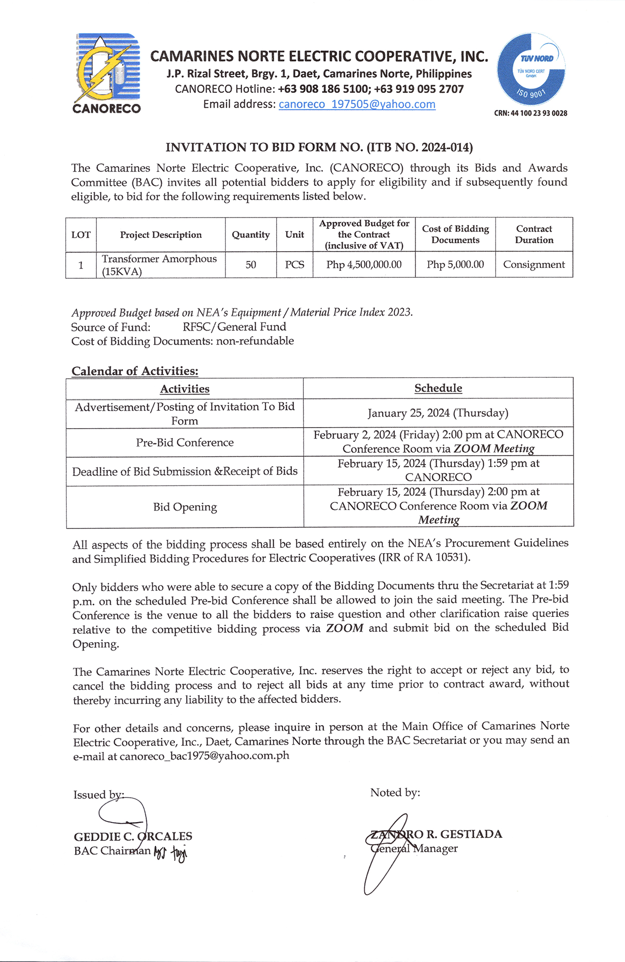 ITB No. 2024-014 – (Transformer Amorphous (15KVA)