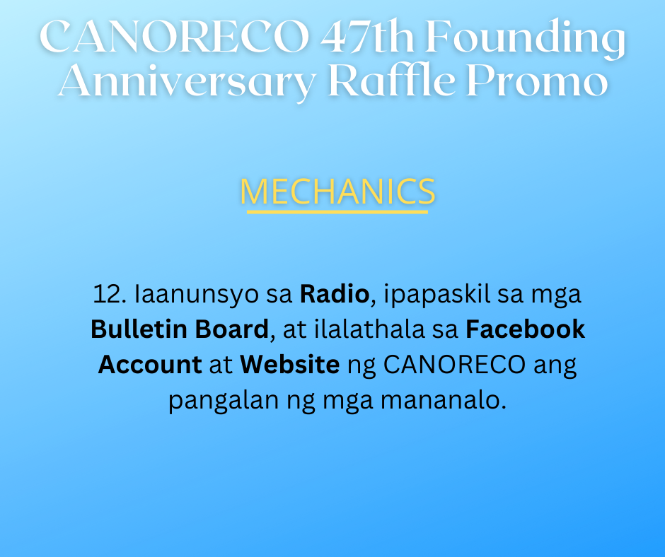 12. Iaanunsyo sa Radio, ipapaskil sa mga Bulletin Board, at ilalathala sa Facebook Account at Website ng CANORECO ang pangalan ng mga mananalo.