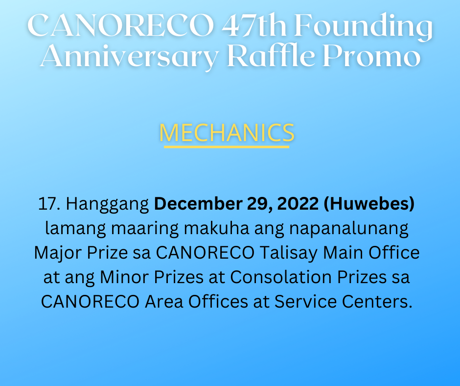 17. Hanggang December 29, 2022 (Huwebes) lamang maaring makuha ang napanalunang Major Prize sa CANORECO Talisay Main Office at ang Minor Prizes at Consolation Prizes sa CANORECO Area Offices at Service Centers.