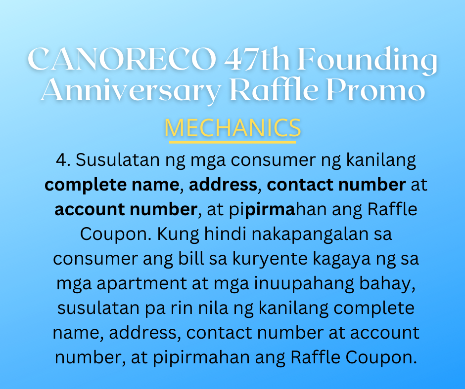 3. Sa mga consumer na nagbabayad online sa pamamagitan ng GCash, PayMaya o 7-Eleven, maaaring kumuha ng Raffle Coupon sa pinakamalapit na CANORECO Office o Accredited Bayad Center. Ipakita lamang ang confirmation ng binayarang September 2022 Electric Bill mula sa GCash, PayMaya o 7-Eleven.