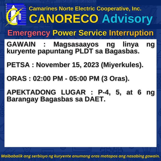 𝐂𝐀𝐍𝐎𝐑𝐄𝐂𝐎 𝐀𝐝𝐯𝐢𝐬𝐨𝐫𝐲: Dahil kinakailangang magsaayos ng nagbabagang bypass switch sa may Brgy. Exciban sa Labo, magkakaroon ng emergency power service interruption sa: Petsa: June 7, 2023 (Miyerkules) Oras: 5:00PM – 6:00PM (1 Oras) Apektadong Lugar: Mula Brgy. Talobatib hanggang Bagong Silang sa LABO; Brgys. Tamisan at San Martin sa JOSE PANGANIBAN; at Bayan ng CAPALONGA […]