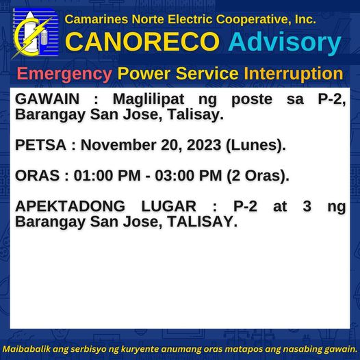 PETSA : November 30, 2022 (Miyerkules) ORAS : 6:00 A.M. – 7:00 A.M. (1 Oras) APEKTADONG LUGAR : Purok 4 Brgy. Gahonon at bahagi ng Brgy. 5 sa DAET. SANHI : Magta-tap ng isang linya ng kuryente.