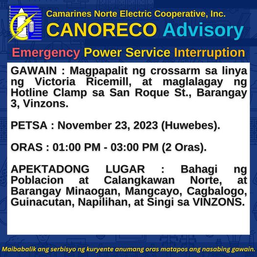 LUGAR : Bahagi ng Poblacion at Calangkawan Norte, at Brgys. Minaogan, Mangcayo, Cagbalogo, Guinacutan, Napilihan at Singi sa VINZONS.