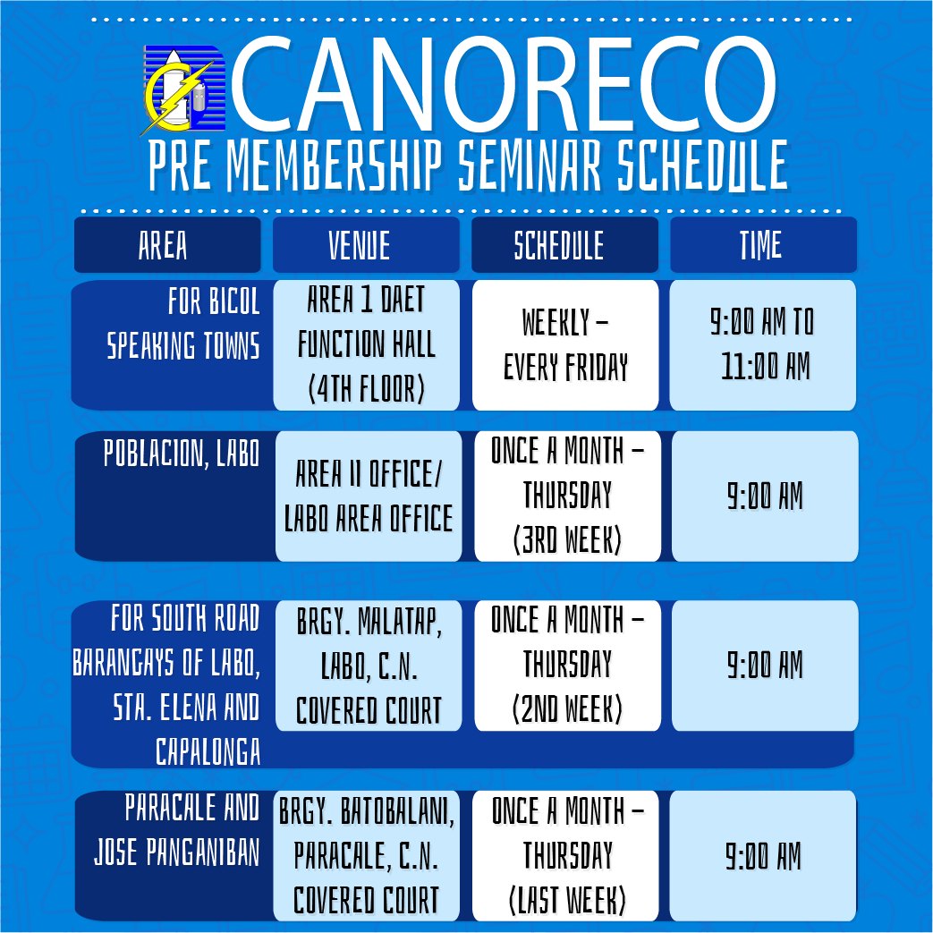TANDAAN. Narito ang ating schedule para sa ating Pre-Membership Seminar. Kung ikaw ay 18 taong gulang pataas at nagpa-plano na magpakabit ng kuryente ay maaari kang umattend ng seminar na ito. Kita-kita po tayo sa mga nabanggit ng mga lugar at petsa. Salamat po!