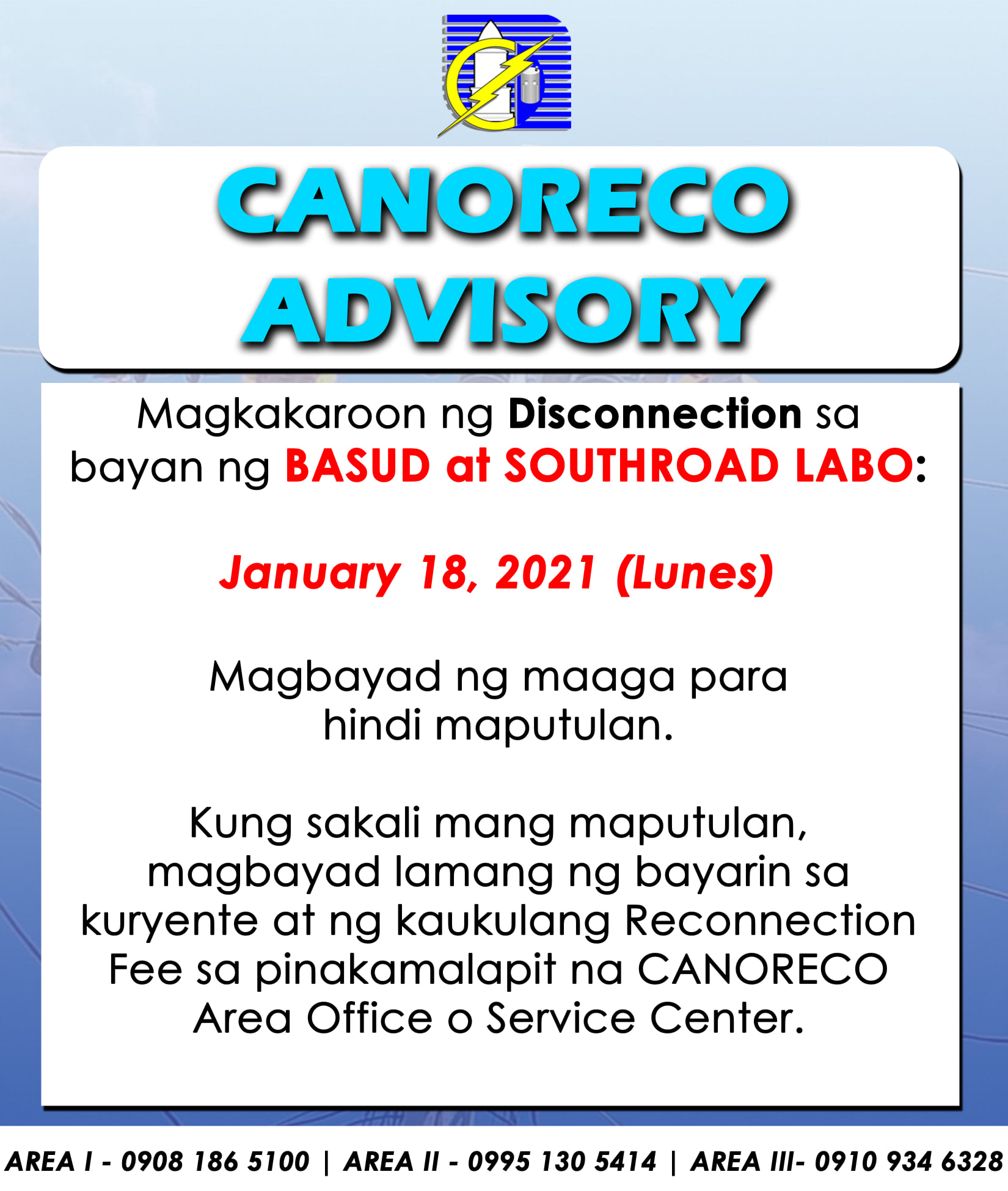 Magkakaroon ng DISCONNECTION sa mga sumusunod na barangay sa bayan ng JOSE PANGANIBAN: – Rizal Ave. – Sitio Luna / GK OsmeƱa – Brgy. San Jose – Calambayungan / Brgy. Larap – Areola St. – Marketsite / Orange Hill – Brgy. Sta. Rosa Norte / Brgy. Motherlode – Brgy. Gumaus – Brgy. Parang – Plaridel […]