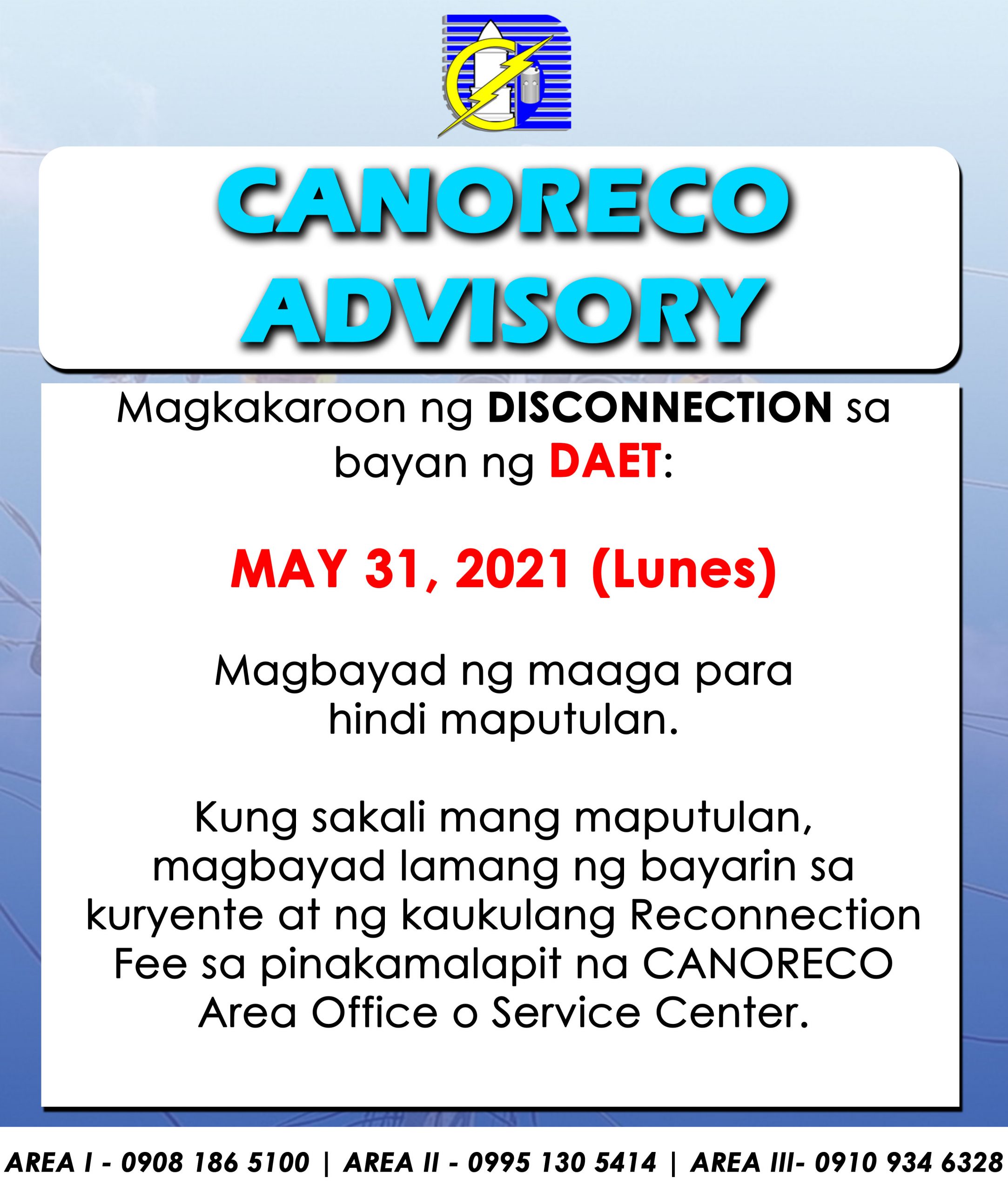 Magkakaroon ng DISCONNECTION sa mga sumusunod na lugar sa bayan ng JOSE PANGANIBAN: SEPTEMBER 20, 2021 (LUNES) – Sta Rosa Sur – Parang – Berlin St. / Bagumbayan – Sta Cruz – Burgos St. / Rizal / Orange Hill – San Pedro – Sta. Milagrosa – Malapayongan / Calero Magbayad ng maaga para hindi maputulan. […]