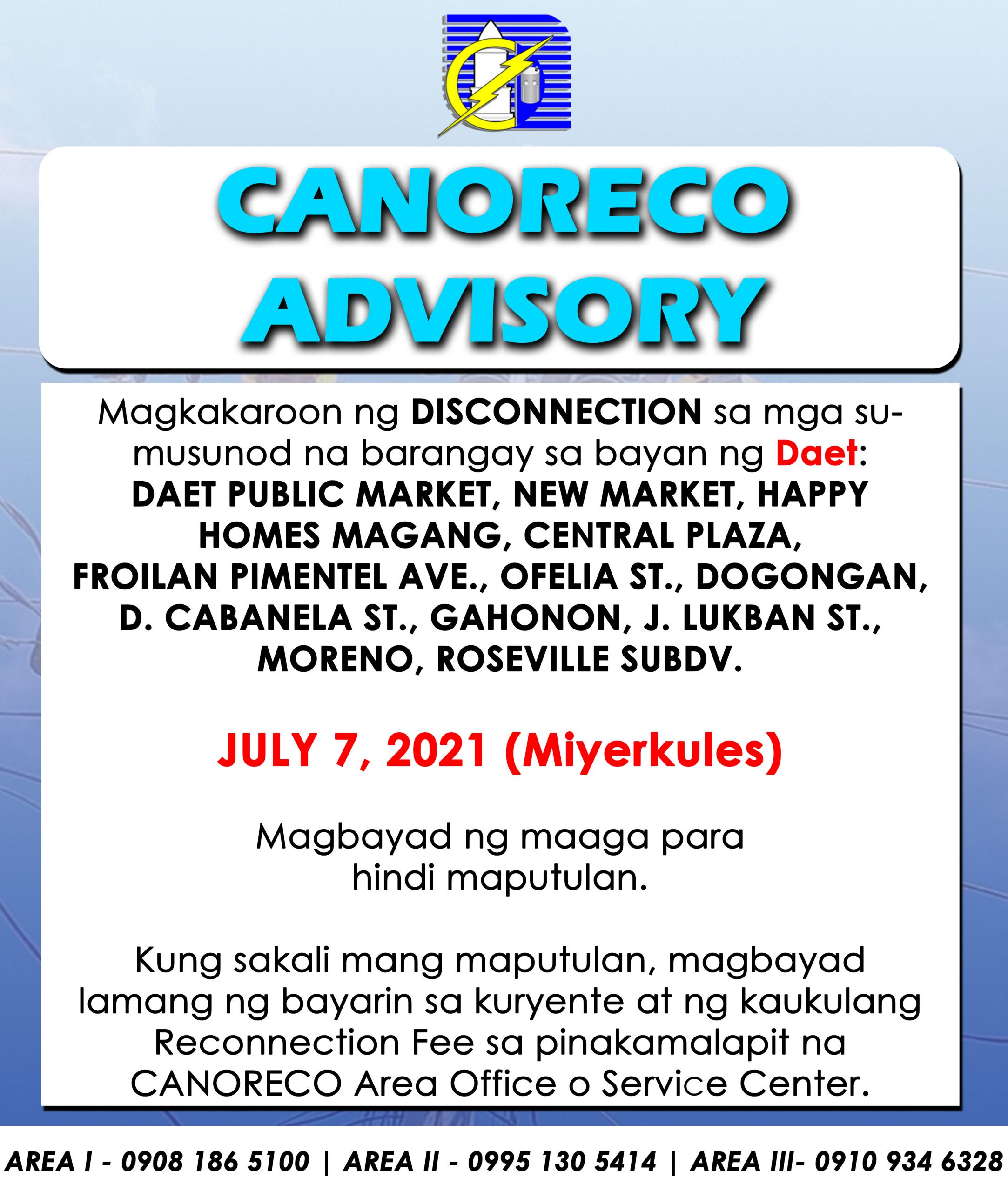 Magkakaroon ng DISCONNECTION sa mga sumusunod na lugar sa bayan ng JOSE PANGANIBAN: OCTOBER 15, 2021 (Biyernes) 1503 – Rizal Ave. 1529/30 – Sitio Luna / GK OsmeƱa 1526 – San Jose 1515 – Calambayungan / Larap 1508 – Areola St. 1507 – Marketsite / Orange Hill 1502 – Sta. Rosa Norte / Motherlode 1522 […]