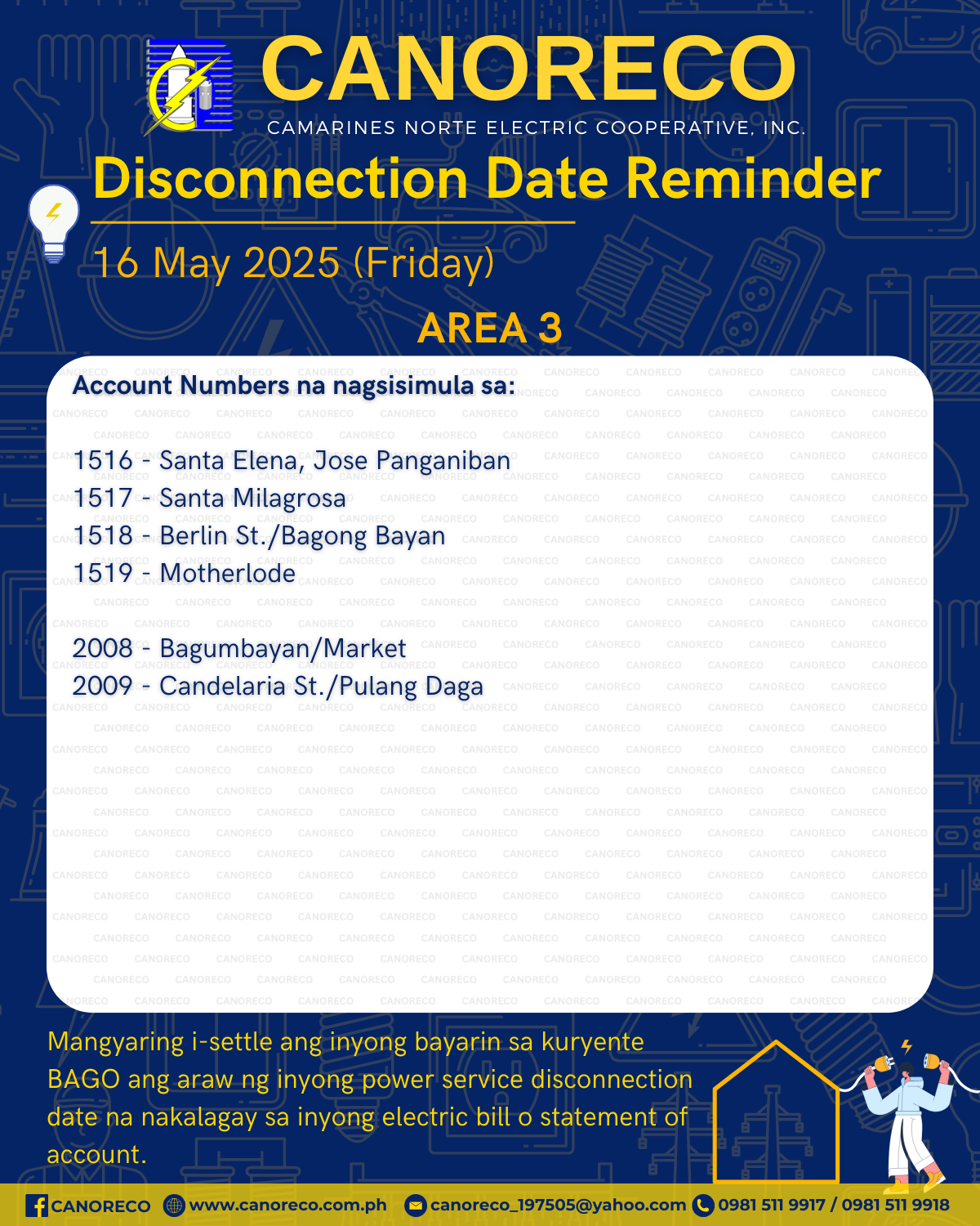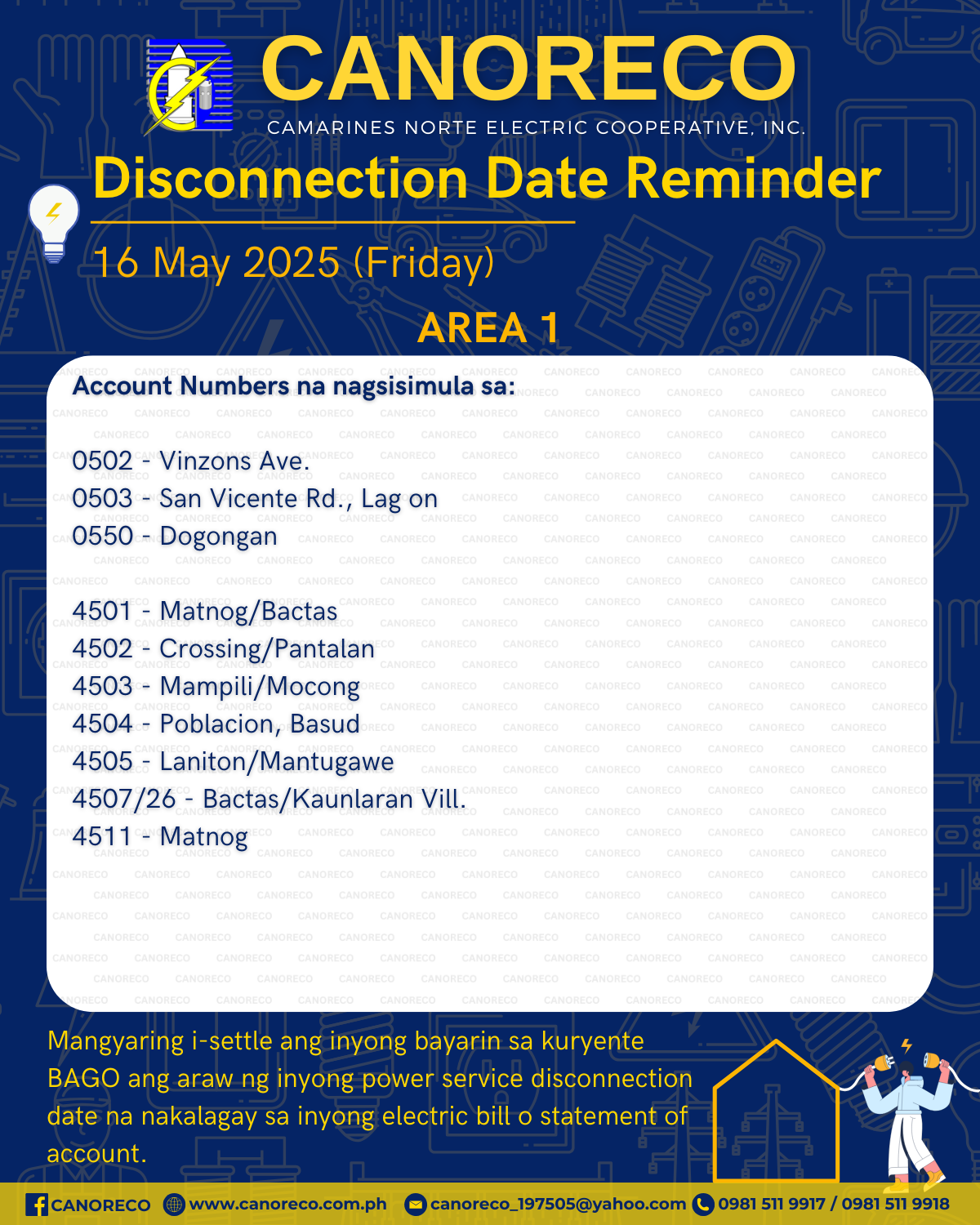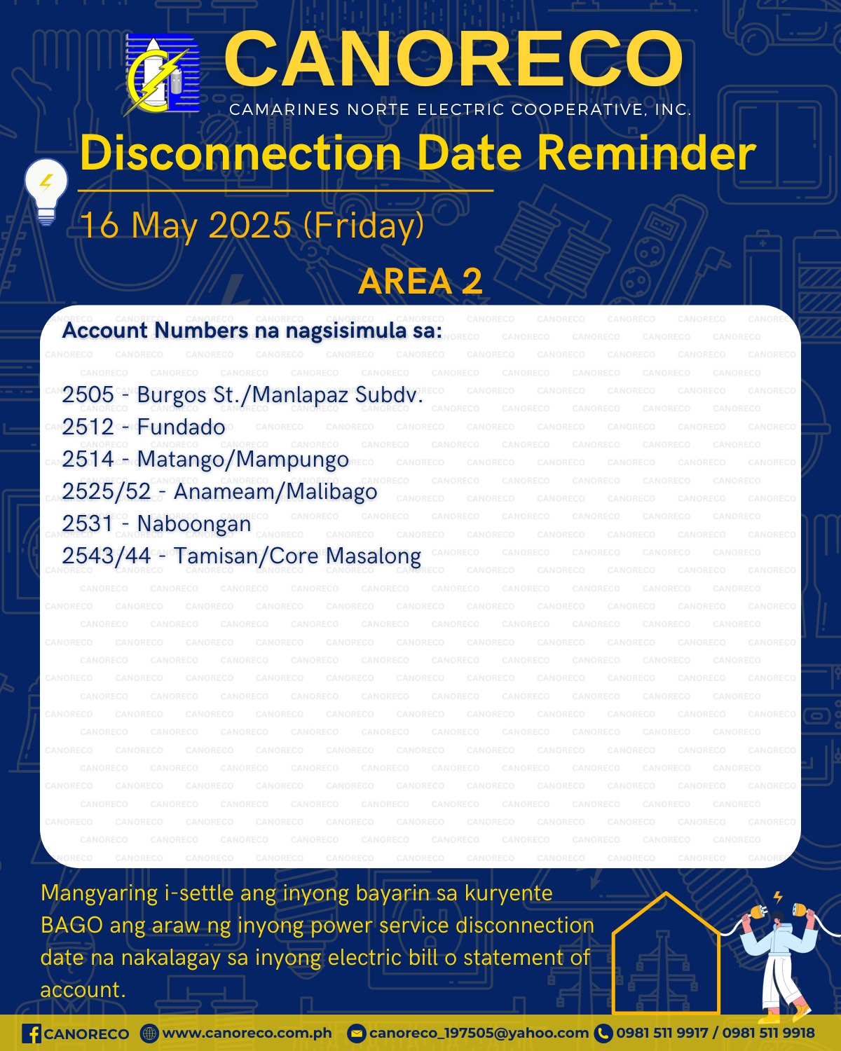 Mga ka-MCOs! Isang malambing na paalala sa mga accounts sa AREA 1, 2, at 3 na scheduled for power service disconnection sa Biyernes (16 May 2025), na i-settle na ang inyong bill sa kuryente bago ang disconnection date. Pero kung nakapagbayad na, wala nang kailangang alalahanin!