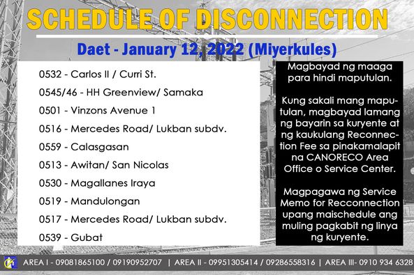 Ang nararanasang biglaang pagkawala ng serbisyo ng kuryente ngayong Lunes, 09 February 2026, mula 12:11 ng hating gabi ay dahil sa disturbance sa linya. APEKTADONG LUGAR: > Bayan ng CAPALONGA; > Brgys. Pangpang, Calabasa, Maot, Pag-asa, Malangcao-basud, Daguit, Submakin, Macogon, Exciban, Dumagmang, Bagong Silang 1, 2, 3, at bahagi ng Talobatib, Matanlang, at Malatap sa […]