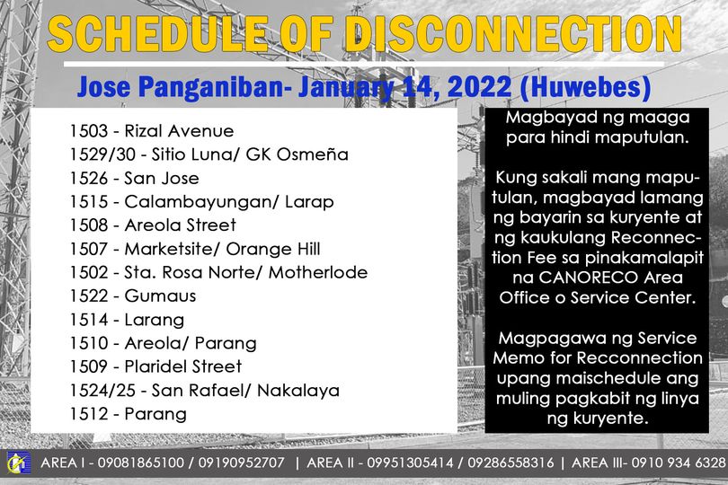 Ang nararanasang biglaang pagkawala ng kuryente ngayong Huwebes, 24 July 2025, mula 8:45 ng gabi ay dahil sa disturbance sa linya. APEKTADONG LUGAR; > Bayan ng BASUD; > Coastal Barangays ng MERCEDES; > South Barangays ng SAN LORENZO RUIZ. Sa kasalukuyan ay inaasikaso na ng Technical personnel ng Area 1 Office ang pagbabalik ng serbisyo […]