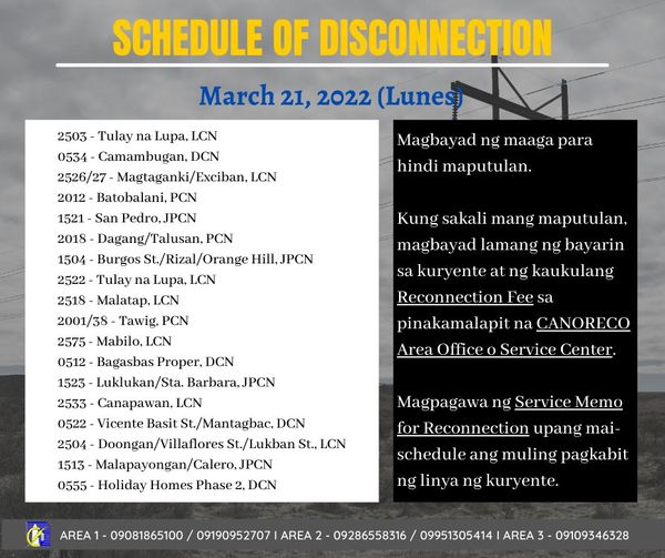 CANORECO Advisory: POWER SERVICE INTERRUPTION