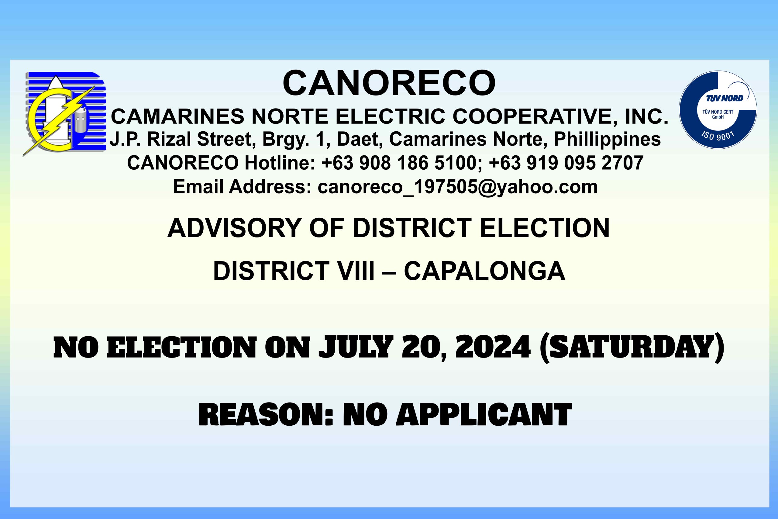 Wala pong magaganap na District Election para sa pagka-Director ng inyong distrito ngayong darating na July 20, 2024 (Sabado) sa kadahilanang walang nakapag-file ng Certificate of Candidady (COC) o walang aplikante.