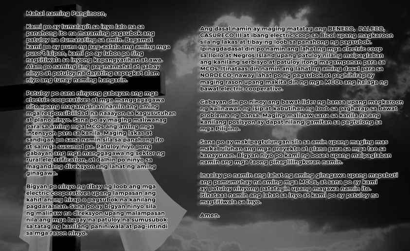 Muli po ninyo kaming samahan sa maikling panalangin na ito para sa ating mga Electric Cooperatives, member-consumer-owners, at para sa bayanπ‘ Mahal na Panginoon, Kami po ay nagpapasalamat sa lahat ng biyayang ipinagkakaloob ninyo sa amin. Naging makabuluhan po ang pagpapakita namin ng pagkakaisa nitong mga nakaraang buwan, at nagpapasalamat po kami dahil alam naming […]