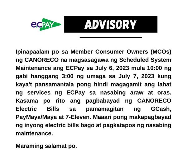 Ipinapaalam po sa Member Consumer Owners (MCOs) ng CANORECO na magsasagawa ng Scheduled System Maintenance ang ECPay sa July 6, 2023 mula 10:00 ng gabi hanggang 3:00 ng umaga sa July 7, 2023 kung kaya’t pansamantala pong hindi magagamit ang lahat ng services ng ECPay sa mga nasabing araw at oras. Kasama po rito ang pagbabayad ng CANORECO Electric Bills sa pamamagitan ng GCash, PayMaya/Maya at 7-Eleven. Maaari pong makapagbayad ng inyong electric bills bago at pagkatapos ng nasabing maintenance.