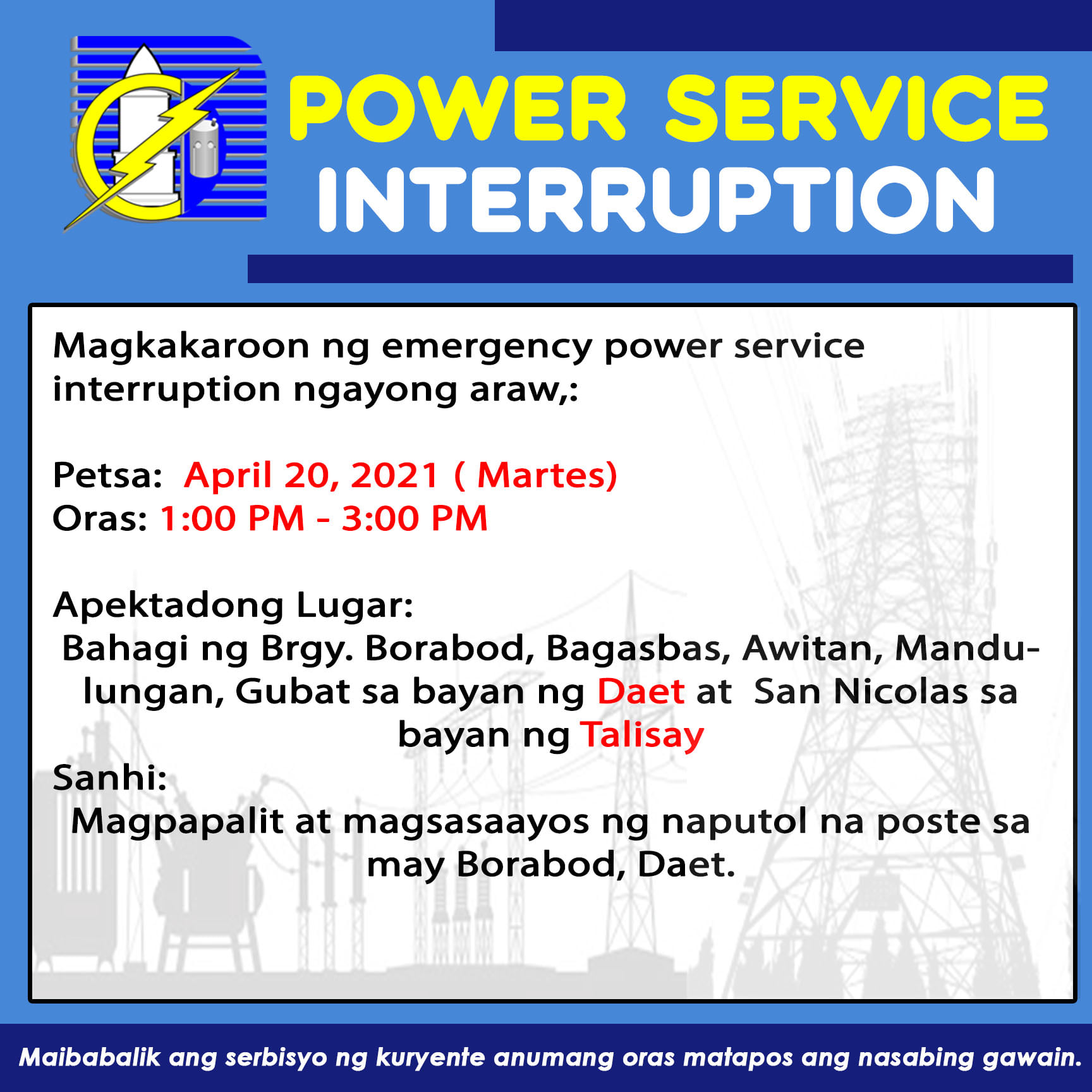 Magkakaroon ng emergency power service interruption ngayong araw, April 20, 2021 (Martes)