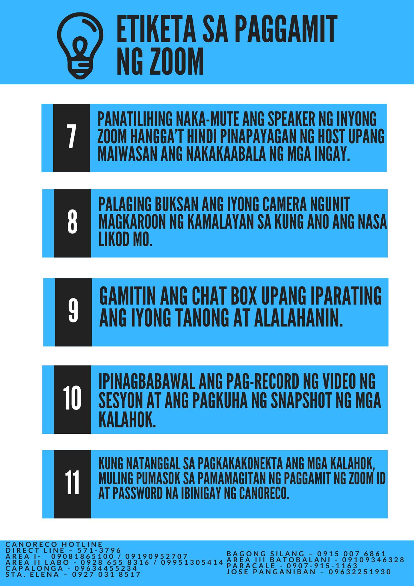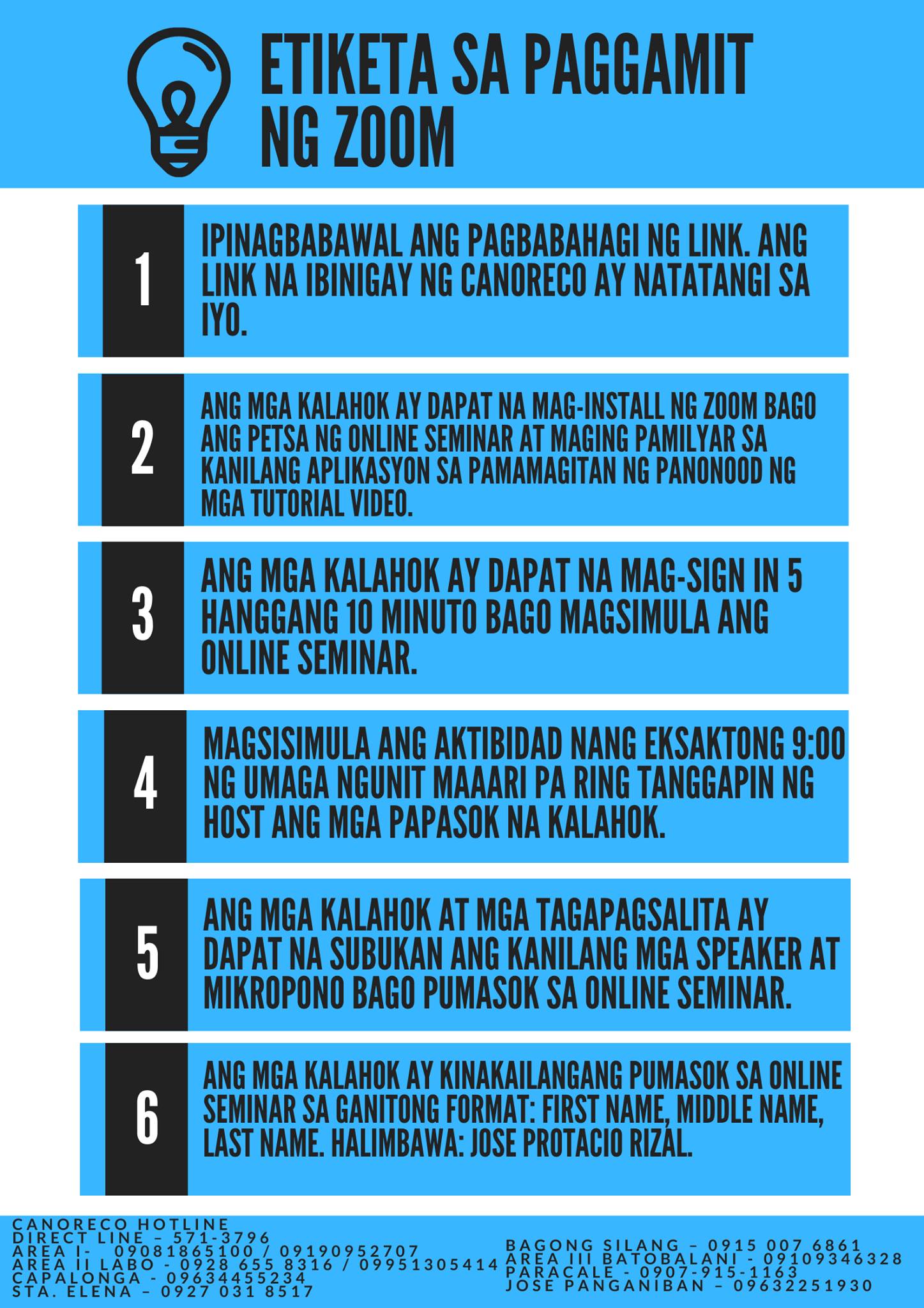 Narito po ang ilang tuntunin o etiketa sa paggamit ng ZOOM sa Pre Membership Seminar (PMS) ng CANORECO.