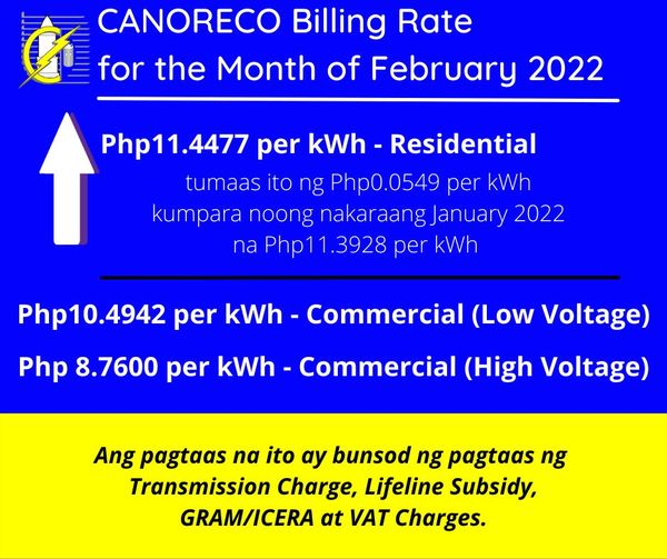 Bahagyang tumaas ang billing rates na babayaran para sa February 2022 billing. Ang residential rate ay Php11.4477 per kWh na kumpara sa Php11.3928 per kWh lamang noong nakaraang January 2022 billing. Ang low voltage rate ay Php10.4942 per kWh at ang high voltage rate naman ay Php8.7600 per kWh. Nagkaroon ng pagtaas na nasa Php0.0549 per kWh.