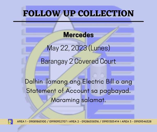 Maaari po ritong magbayad ng kanilang bayarin sa kuryente ang mga taga-bayan ng Mercedes. Pakidala lamang po ang electric bill o ang statement of account sa inyong pagbayad.