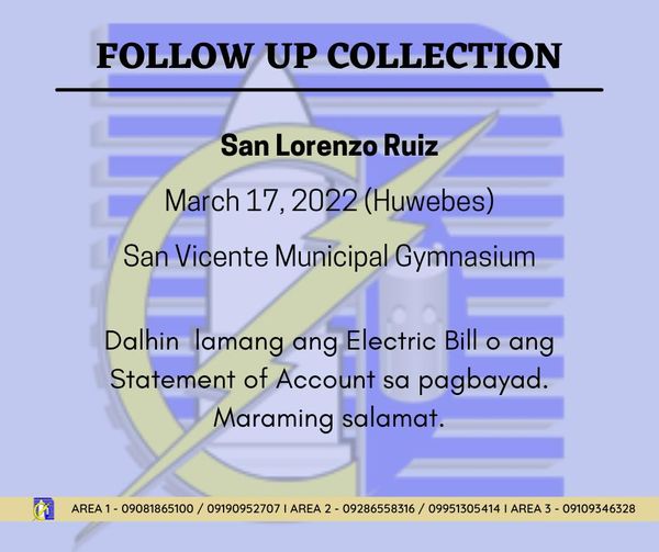 𝐏𝐀𝐀𝐋𝐀𝐋𝐀. Ang schedule ng Follow Up Collection sa February 13, 2023, sa Basud Old Sports Complex. Maaari po ritong magbayad ng kanilang bayarin sa kuryente ang mga taga-bayan ng Basud. Pakidala lamang po ang electric bill o ang statement of account sa inyong pagbayad. Maraming salamat po!
