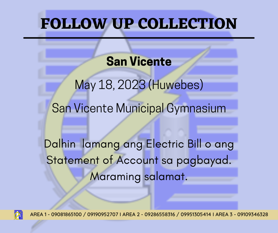 Maaari po ritong magbayad ng kanilang bayarin sa kuryente ang mga taga-bayan ng San Vicente. Pakidala lamang po ang electric bill o ang statement of account sa inyong pagbayad.