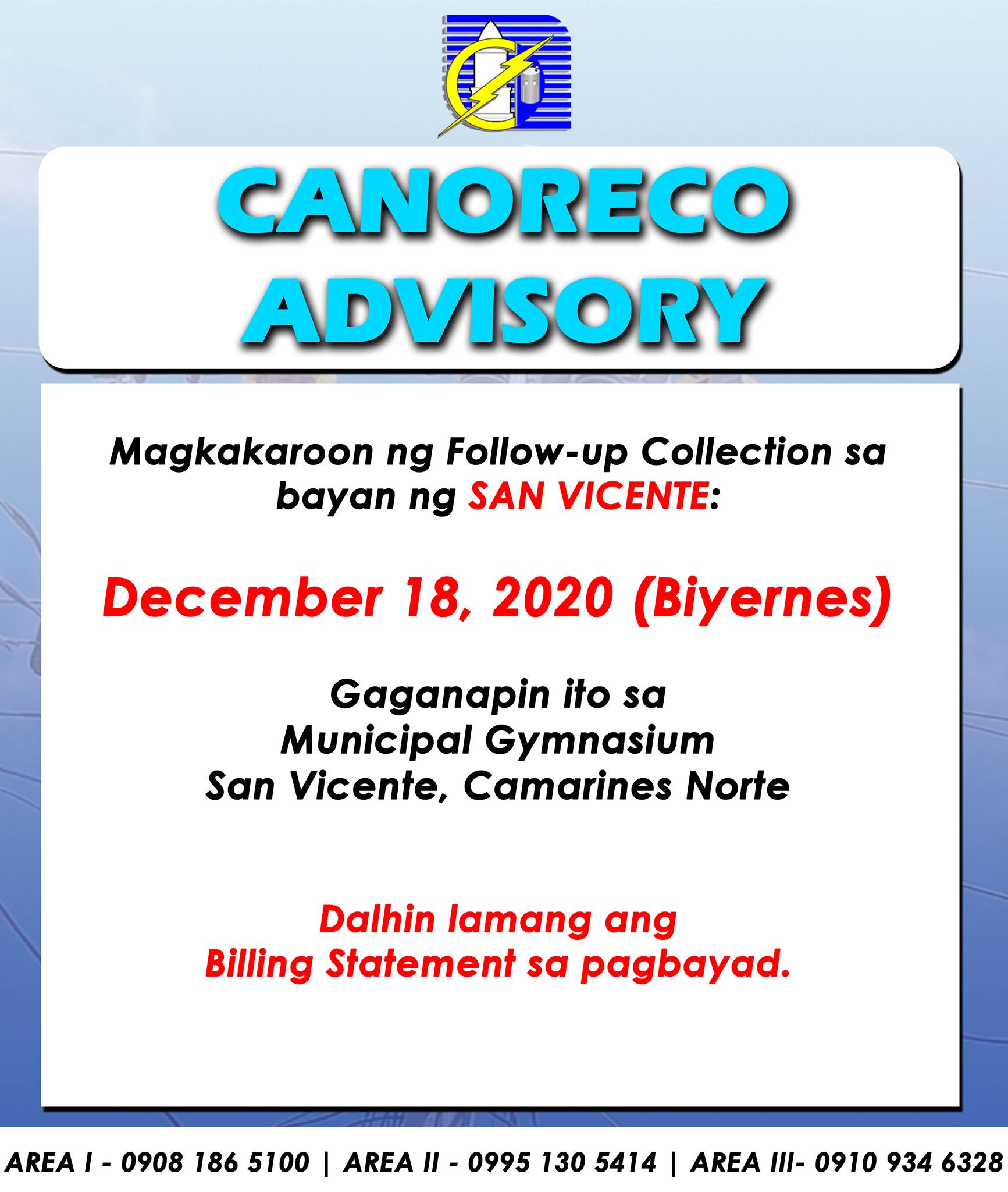 Kaugnay ng patuloy na malakas na pag-ulan na dulot ng shear line kung saan apektado ang Camarines Norte, may mga lugar sa ating lalawigan ang kasalukuyang nakararanas ng pagbaha at patuloy na pagtaas ng tubig lalo na sa mga mabababang komunidad at nasa tabing-ilog. Dahil sa sitwasyong ito, nais ipabatid ng CANORECO sa lahat ng […]
