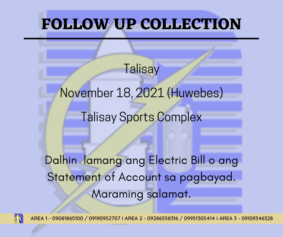 Mga ka-MCOs natin sa Bayan ng VINZONS! Mayroon tayong follow-up collection riyan bukas, Miyerkules (21May 2025), sa Covered Court ng Barangay 1. Dalhin ang inyong Electric Bill o Statement of Account sa pagbabayad. Kita-Kitz!