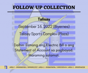 CANORECO Advisories Follow Up Collection – Talisay Posted on September 16, 2022September 16, 2022 Author Comments Off on Follow Up Collection – Talisay