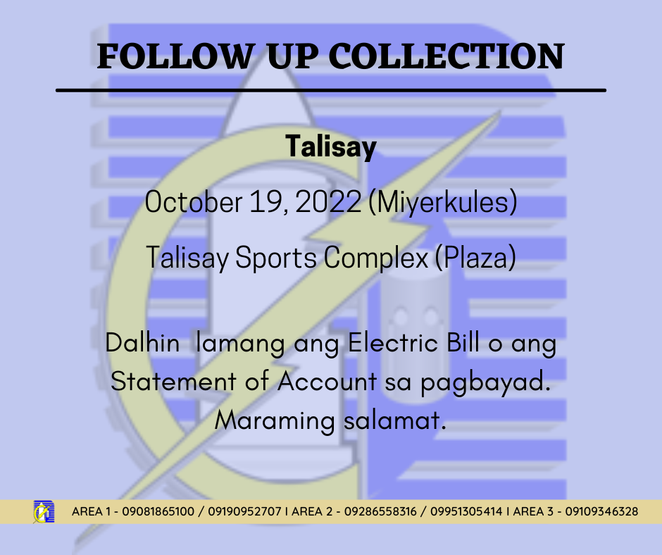 Ipinapaalam sa mga MCO sa bayan ng TALISAY na wala pong follow up collection na isinasagawa ngayong due date sa inyong bayan. Maaari pong magbayad sa Canoreco Talisay Main Office sa Hotel Mega Star para makapagbayad ng inyong konsumo at sa accredited bayad center ng CANORECO sa Talisay, ang JMT Payment Services na nasa brgy. […]