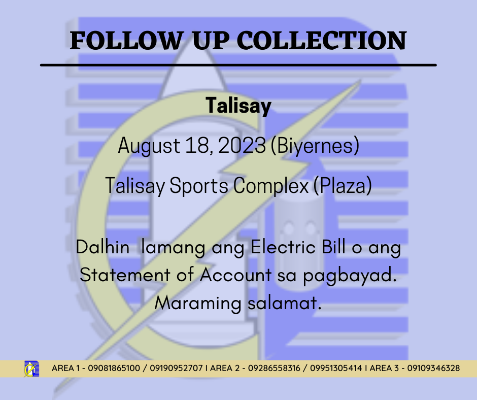 Maaari po ritong magbayad ng kanilang bayarin sa kuryente ang mga taga-bayan ng Talisay. Pakidala lamang po ang electric bill o ang statement of account sa inyong pagbayad.