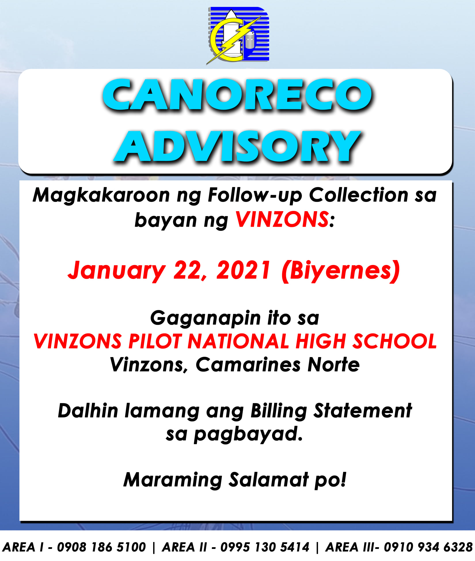 𝐏𝐀𝐀𝐋𝐀𝐋𝐀. Ang schedule ng Follow Up Collection sa July 21, 2023 sa Barangay 1 Covered Court, Vinzons. Maaari po ritong magbayad ng kanilang bayarin sa kuryente ang mga taga-bayan ng Vinzons. Pakidala lamang po ang electric bill o ang statement of account sa inyong pagbayad. Maraming salamat po!