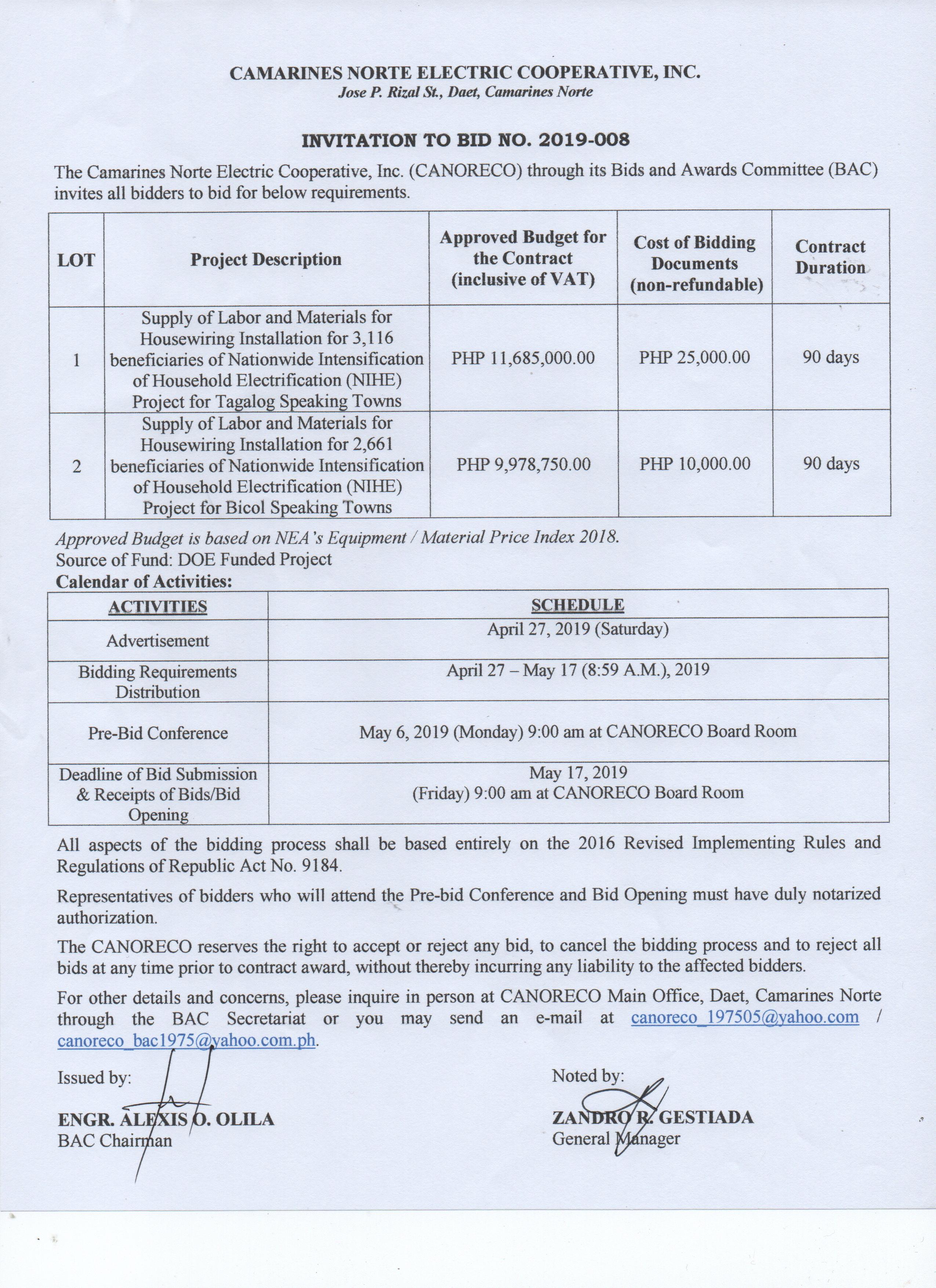 Invitation to Bid ITB 2019-008 MATERIALS FOR HOUSEWIRING INSTALLATION Posted on April 24, 2019 Author Comments Off on ITB 2019-008 MATERIALS FOR HOUSEWIRING INSTALLATION