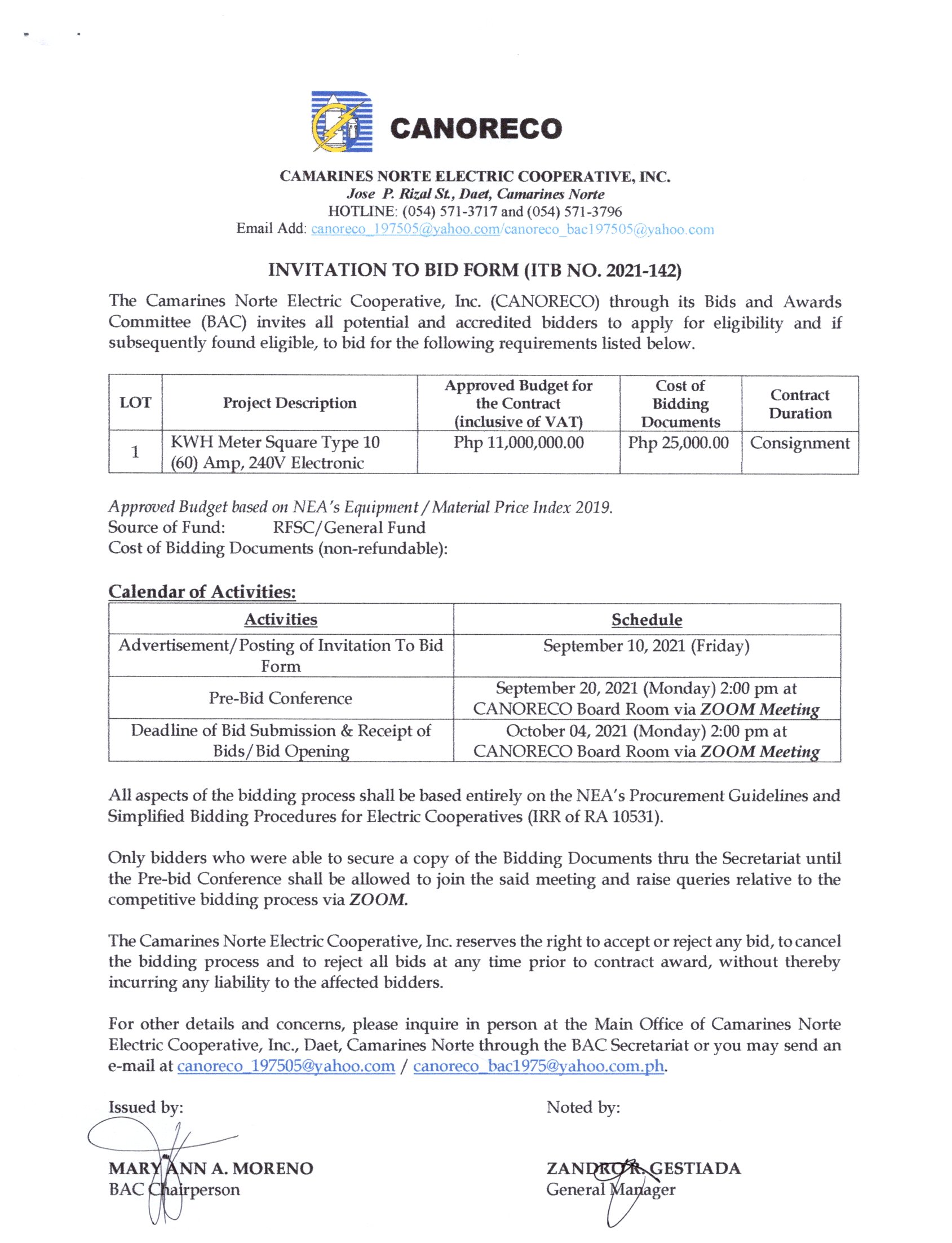 ITB 2025-015 – ANNUAL PREVENTIVE MAINTENANCE OF CANORECO SUBSTATIONS