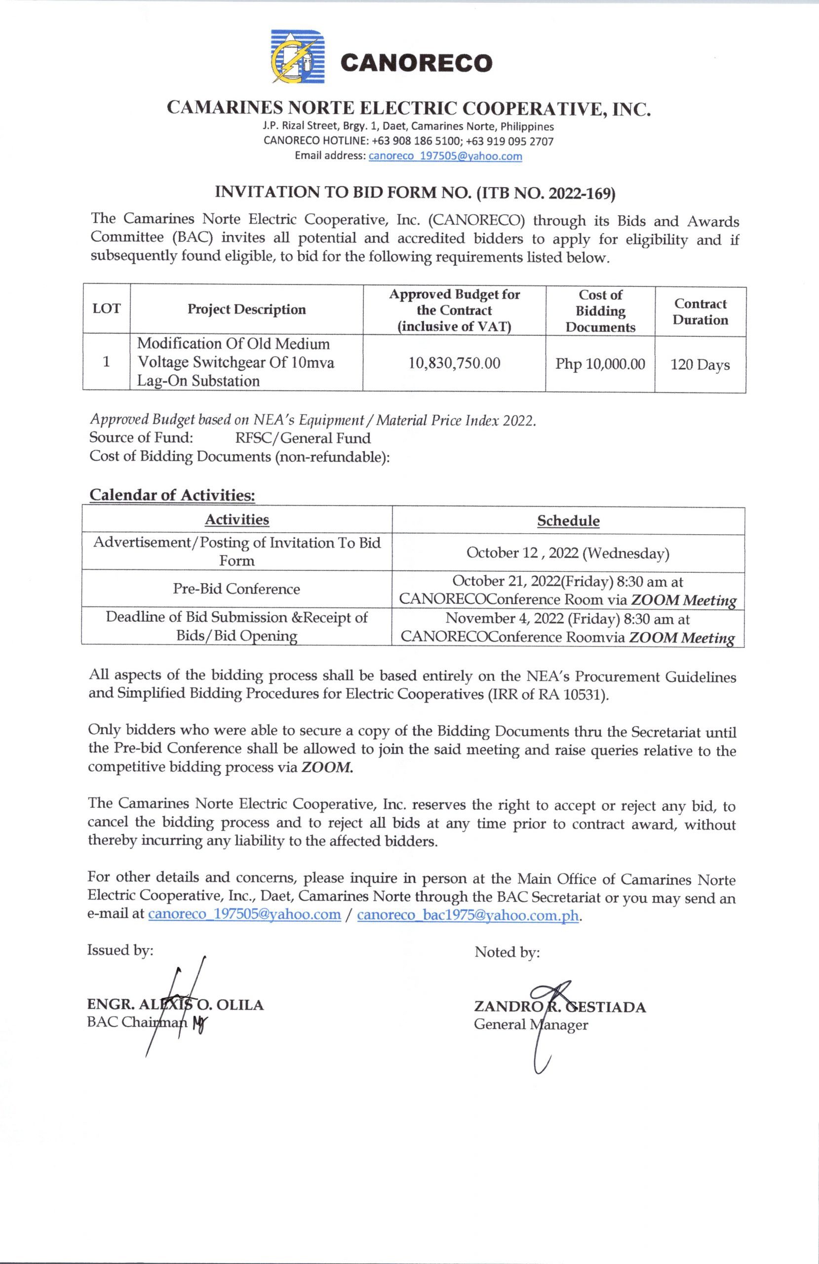 ITB 2025-015 – ANNUAL PREVENTIVE MAINTENANCE OF CANORECO SUBSTATIONS