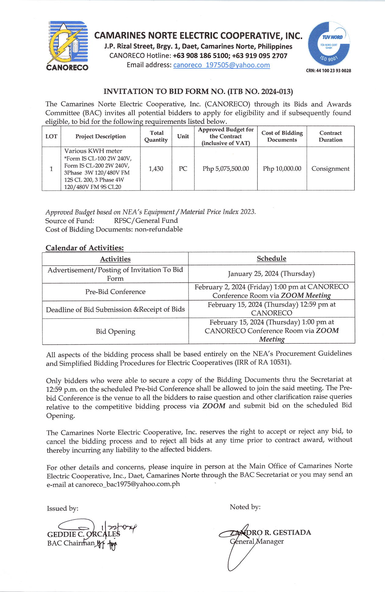 Invitation to Bid ITB No. 2024-013 – (Various KWH Meter) Posted on January 25, 2024 Author Comments Off on ITB No. 2024-013 – (Various KWH Meter)