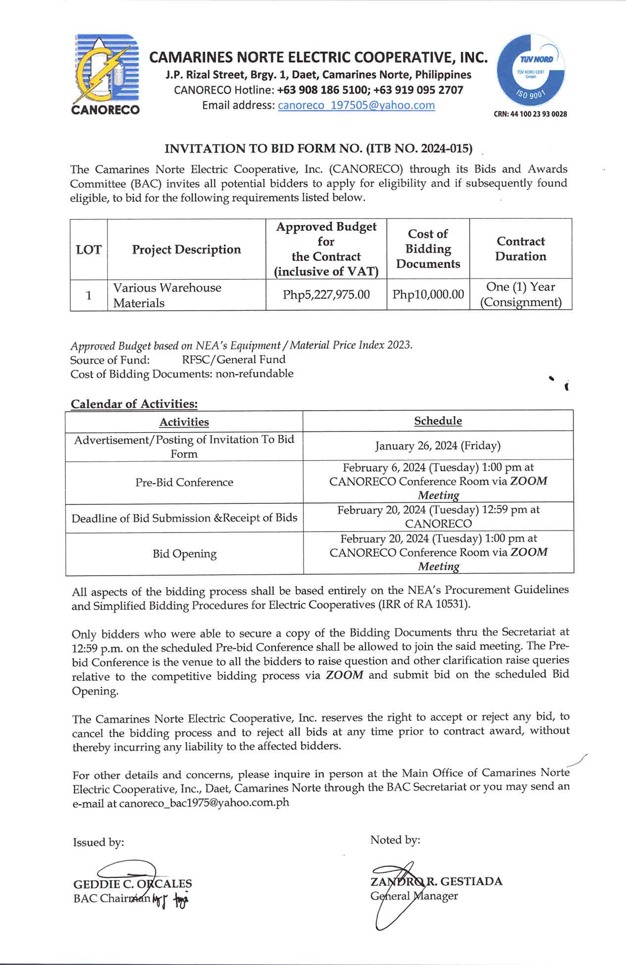 Invitation to Bid ITB No. 2024-015 – (Various Warehouse Materials) Posted on January 25, 2024 Author Comments Off on ITB No. 2024-015 – (Various Warehouse Materials)