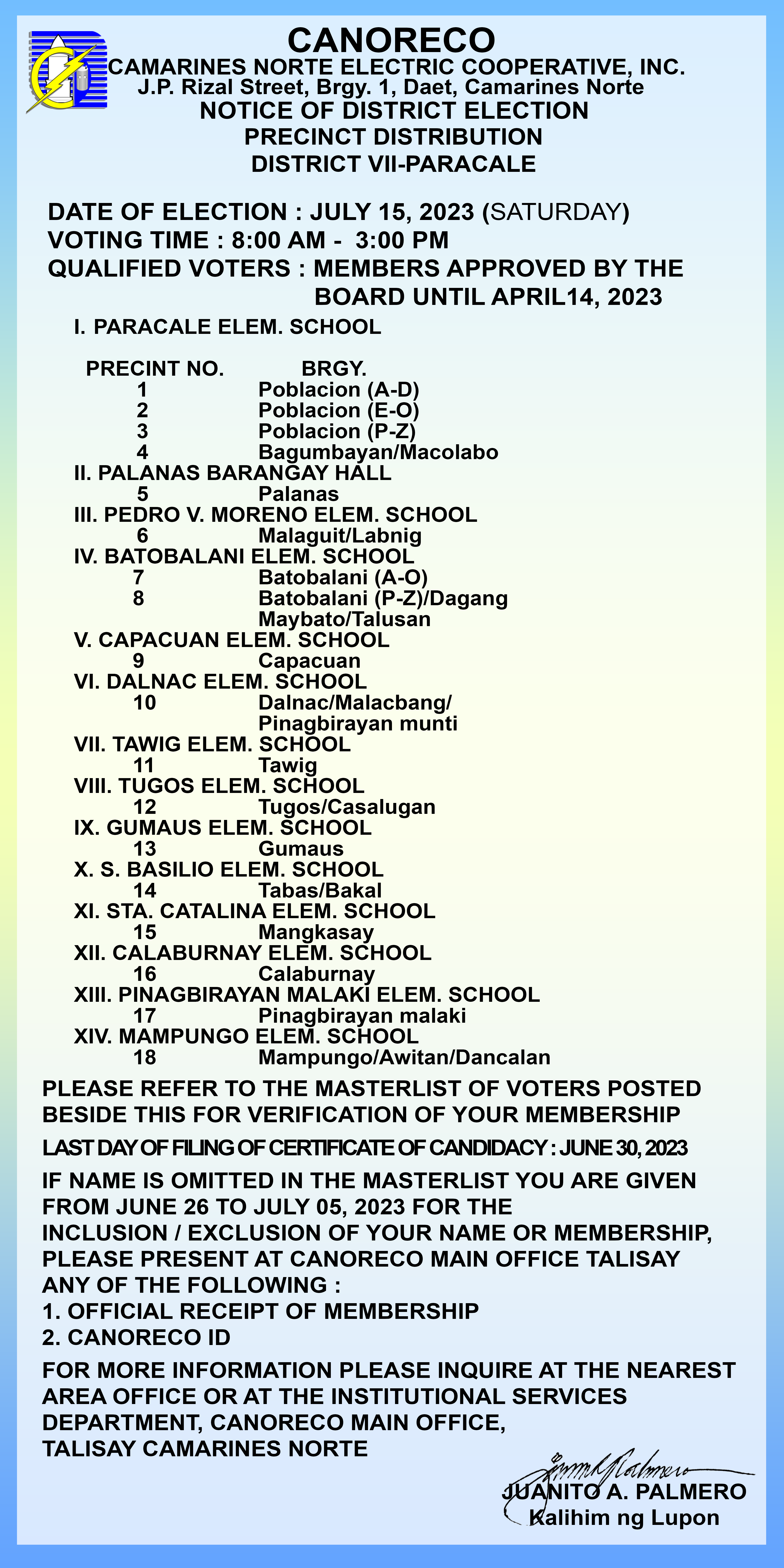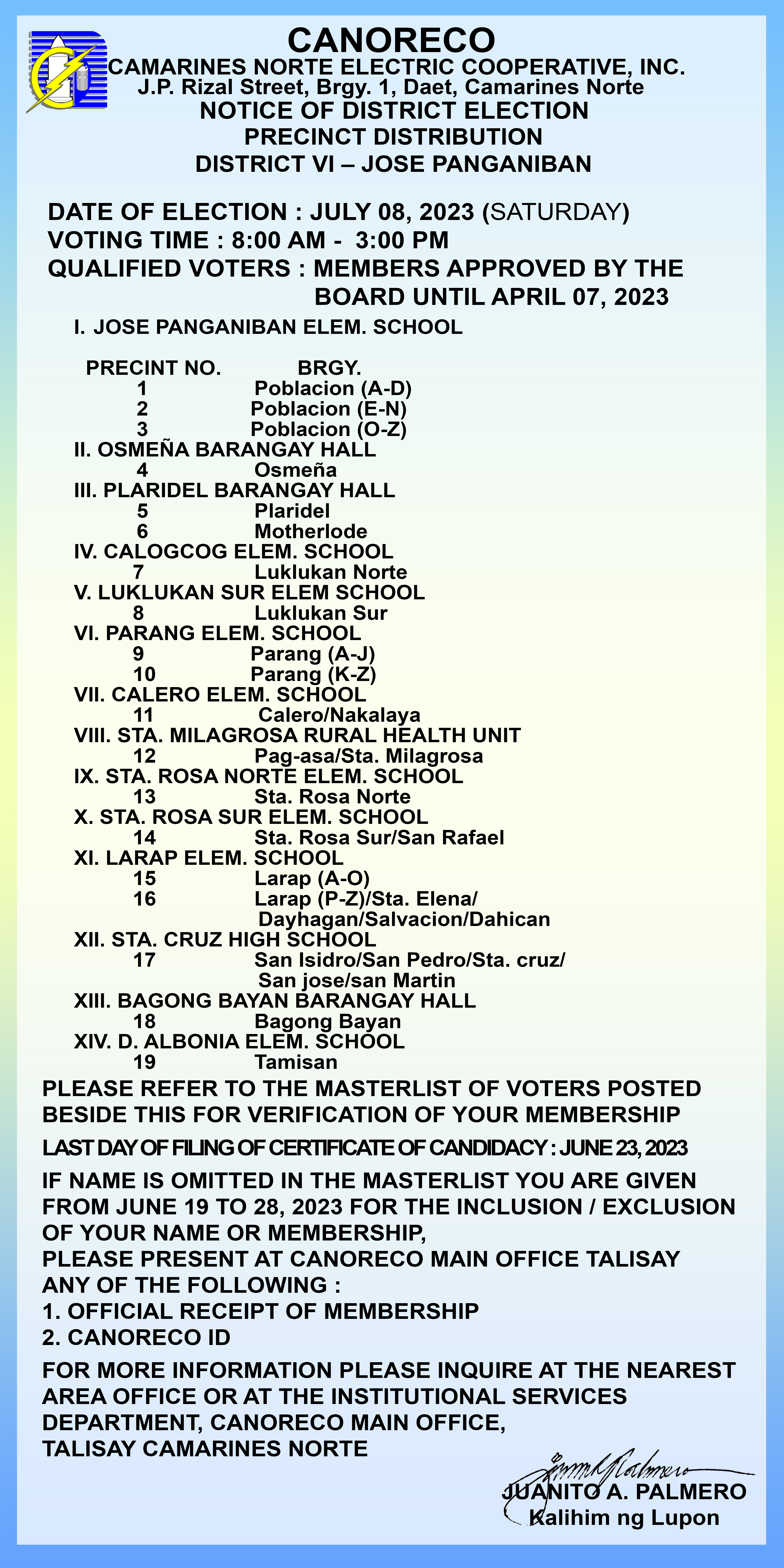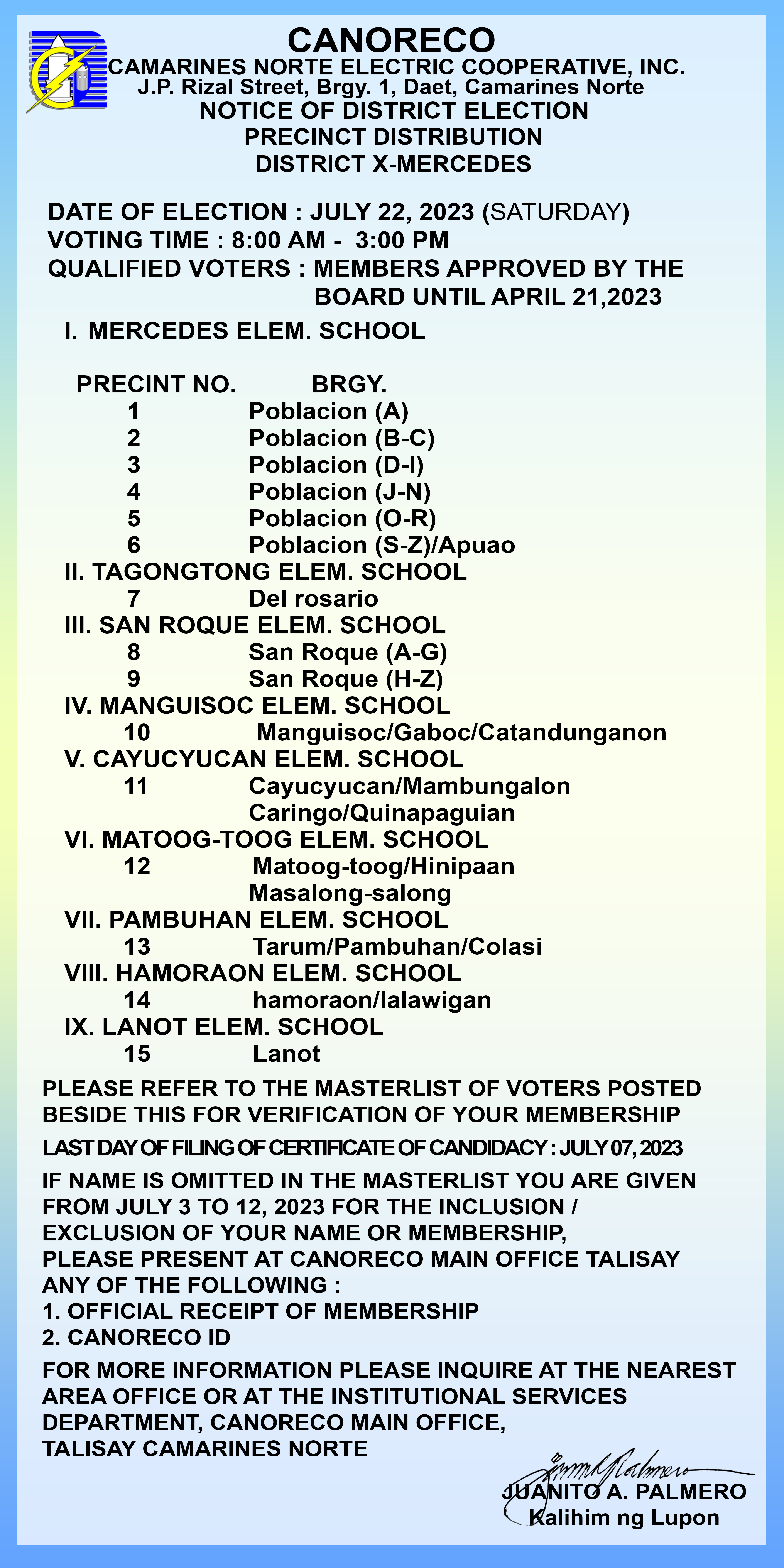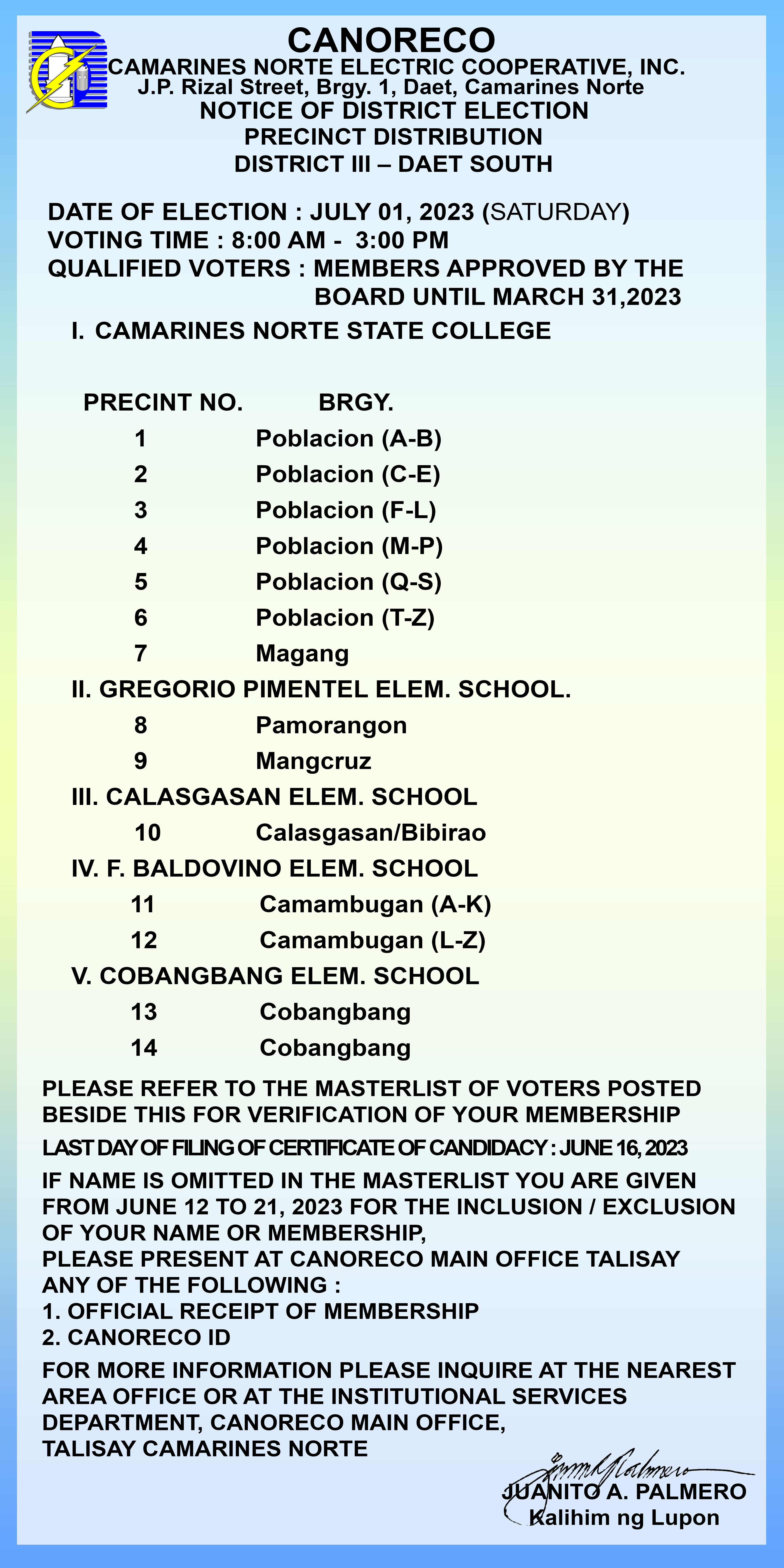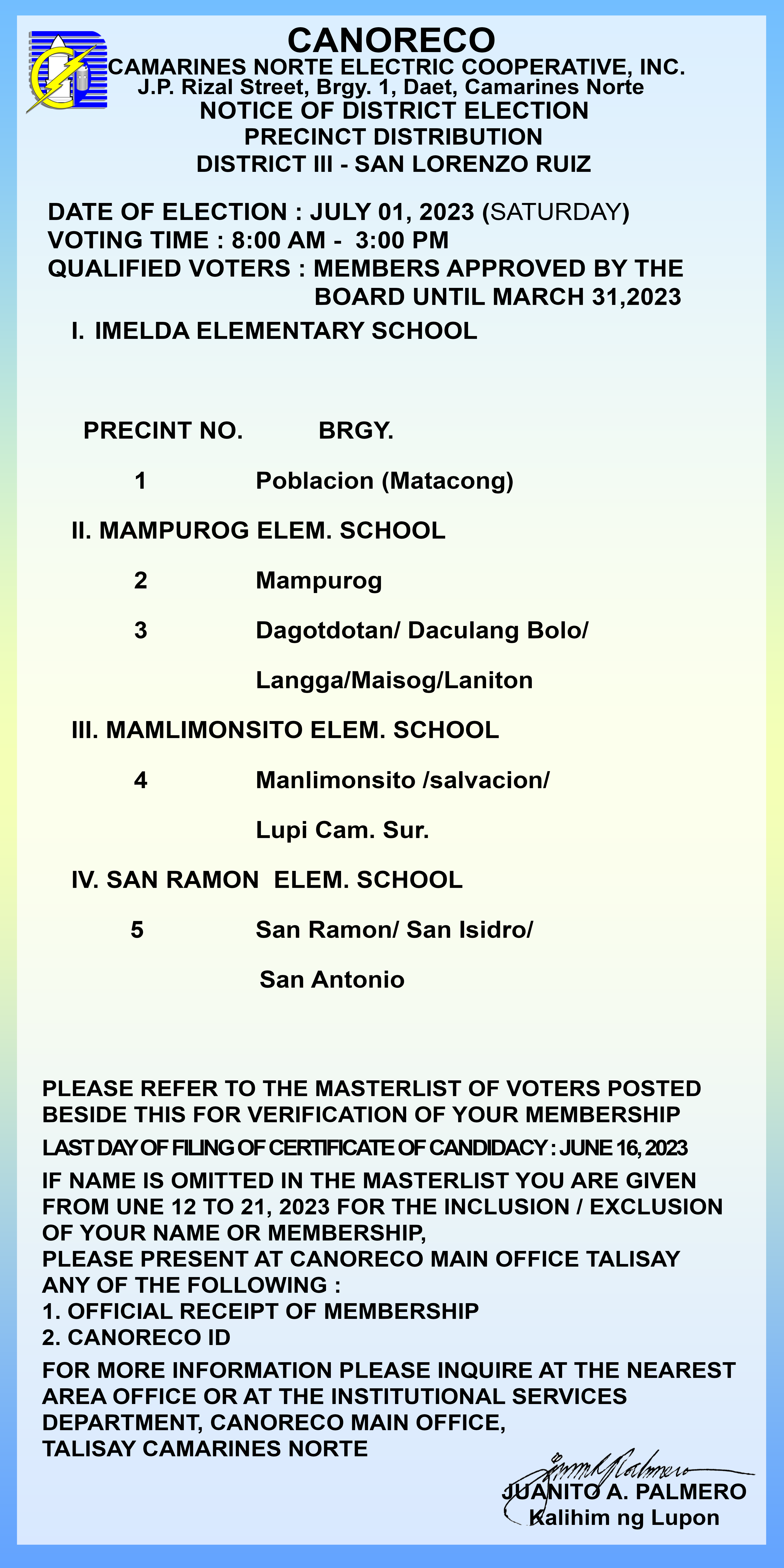 Kasalukuyang nagsasagawa ang CANORECO ng Orientation para sa mga Barangay Member Consumer Owner Officers (Barangay MCO Officers) ng bawat distrito o munisipalidad ng Camarines Norte. Ginawa ang orientation sa mga Barangay MCOs ng distrito ng Labo noong March 14, 2022 mula 1:00 hanggang 5:00 ng hapon sa Labo Sports Complex. Dinaluhan ito nina CANORECO Board […]