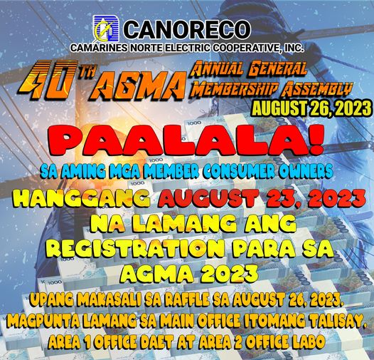 Kung ikaw ay miyembro at hindi pa nakakaparehistro, takbo na sa Main Office sa bayan ng Talisay, sa Area I Office sa bayan ng Daet, o sa Area II Office sa bayan ng Labo. Huwag palagpasin ang pagkakataong manalo ng cash prizes habang nanonood ng A.G.M.A.!