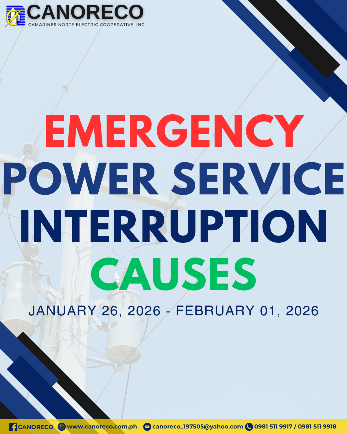 Ang sumusunod ay ang dahilan ng nangyaring biglaang pagkawala ng serbisyo ng kuryente mula January 26, 2026 (Lunes) hanggang February 01, 2026 (Linggo):