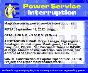 Ipinapaalam po sa mga MCOs na KANSELADO ang ini-anunsyong Scheduled Power Service Interruption sa SEPTEMBER 18, 2022 sa ilang barangay sa mga bayan ng BASUD at SAN LORENZO RUIZ. Maraming salamat po.