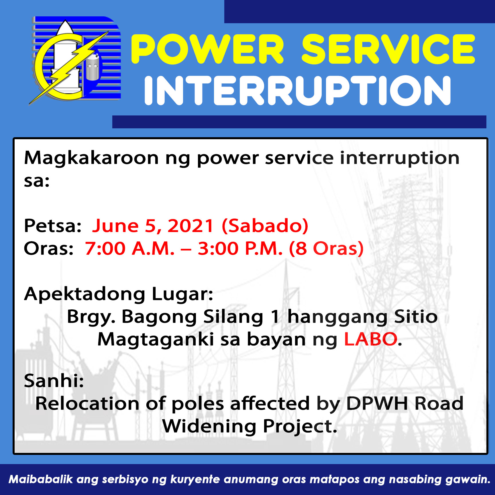 Maaaring maibalik ang serbisyo ng kuryente anumang oras matapos ang nasabing gawain. Para sa kaligtasan ng mga miyembro-konsumidores, parating ituring na may kuryente ang mga linya at mga kagamitan sa lahat ng oras.