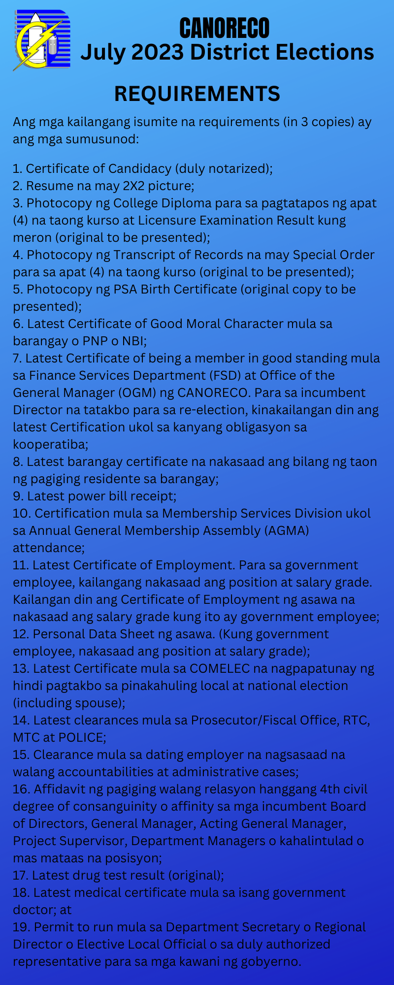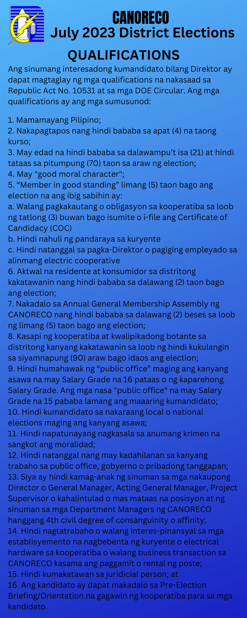Qualifications at Requirements para sa CANORECO Directorship